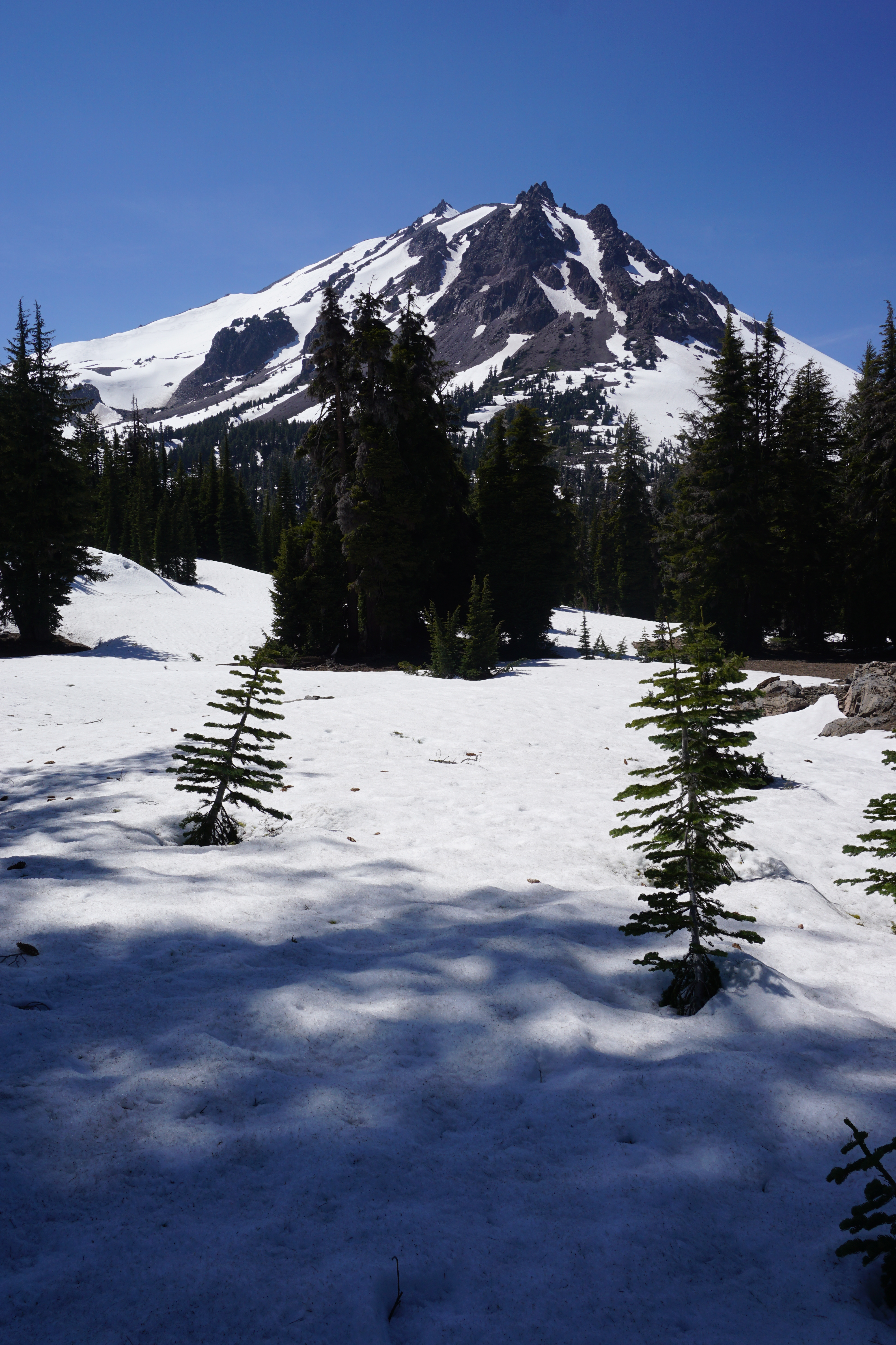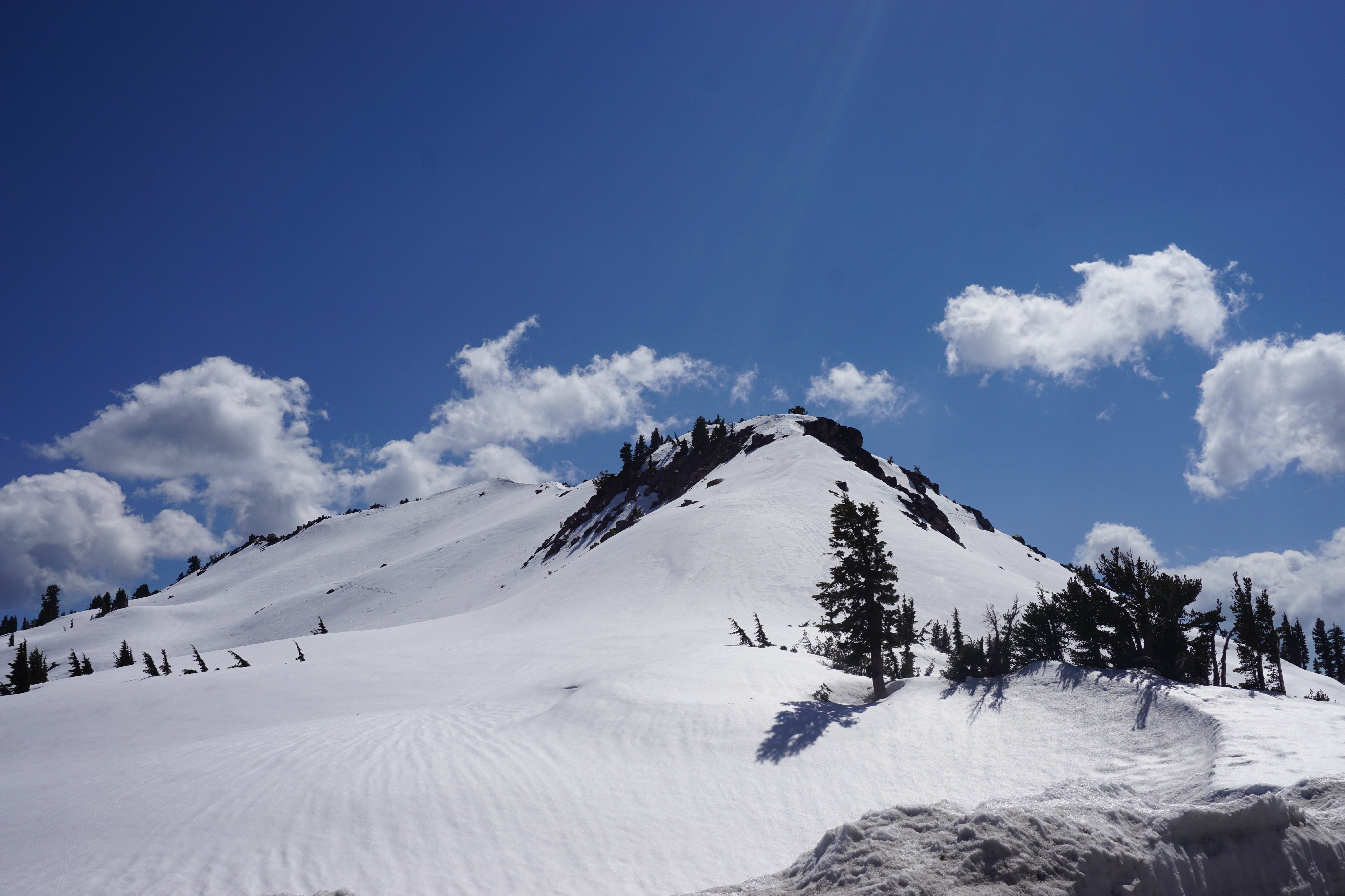 Okay, so it’s near impossible to see in this photo, but if you look really closely at that patch of trees near the middle, you will see a little tiny yellow dot on one of the trees. That’s a trail marker. In winter conditions like these, the goal becomes to locate these little tiny dots, which are placed on a single tree every 1/8 of a mile or so, until you (hopefully) reach your destination. Of course, finding the dots is a royal pain in the butt, and I got lost (and had to backtrack) several times on this short two mile hike to Paradise Meadows. Luckily, I had Mt. Lassen to the south of me to act as a compass of sorts.