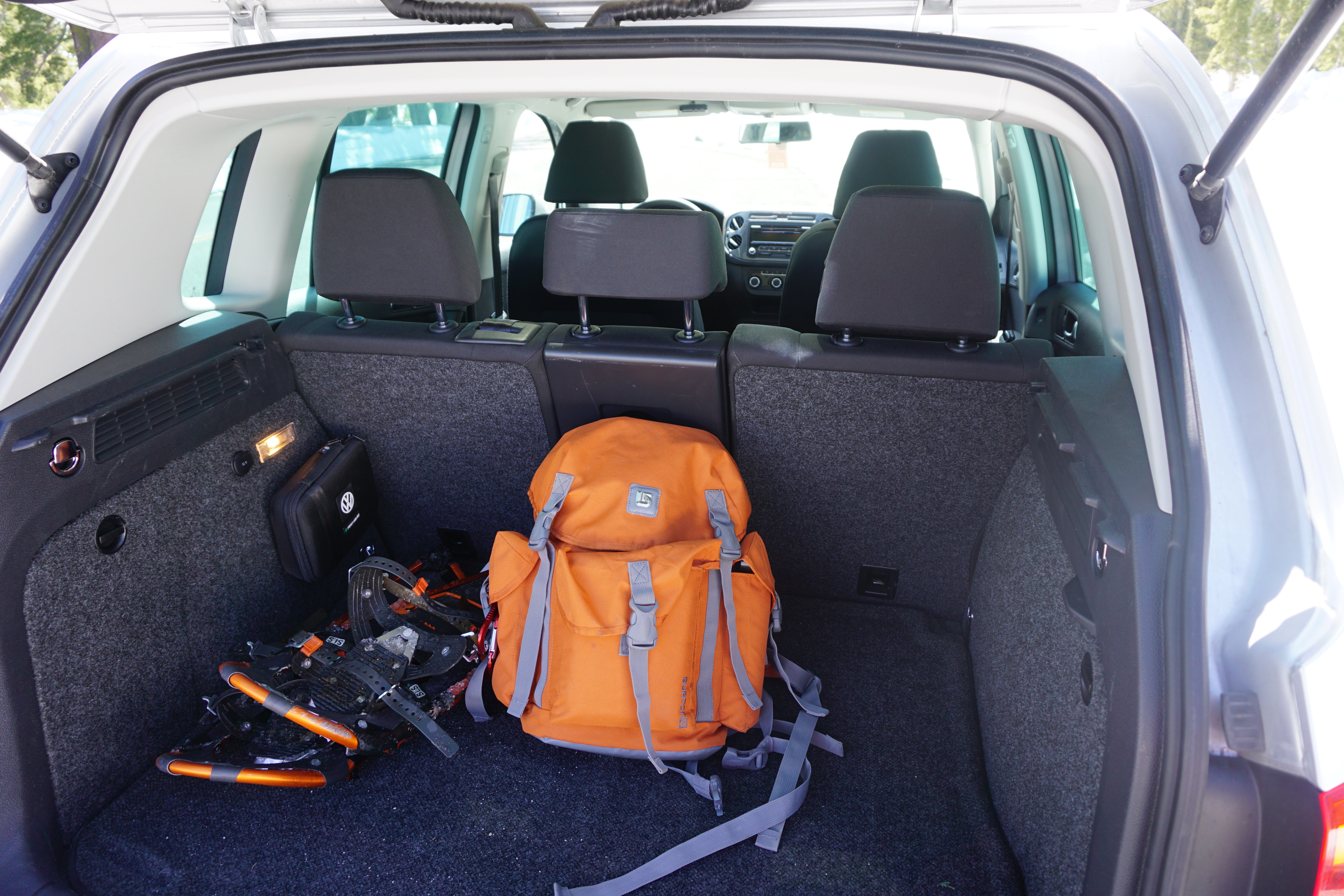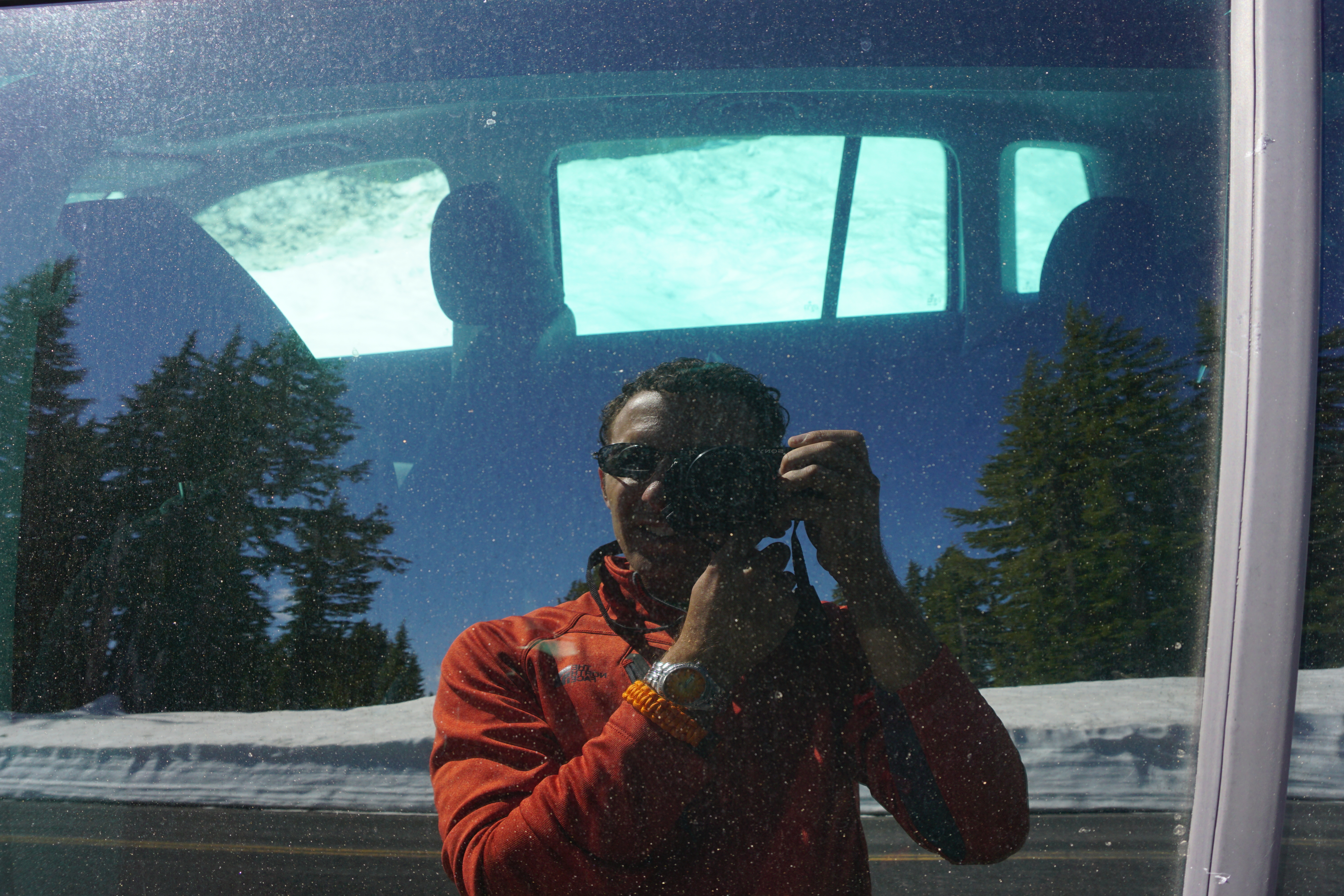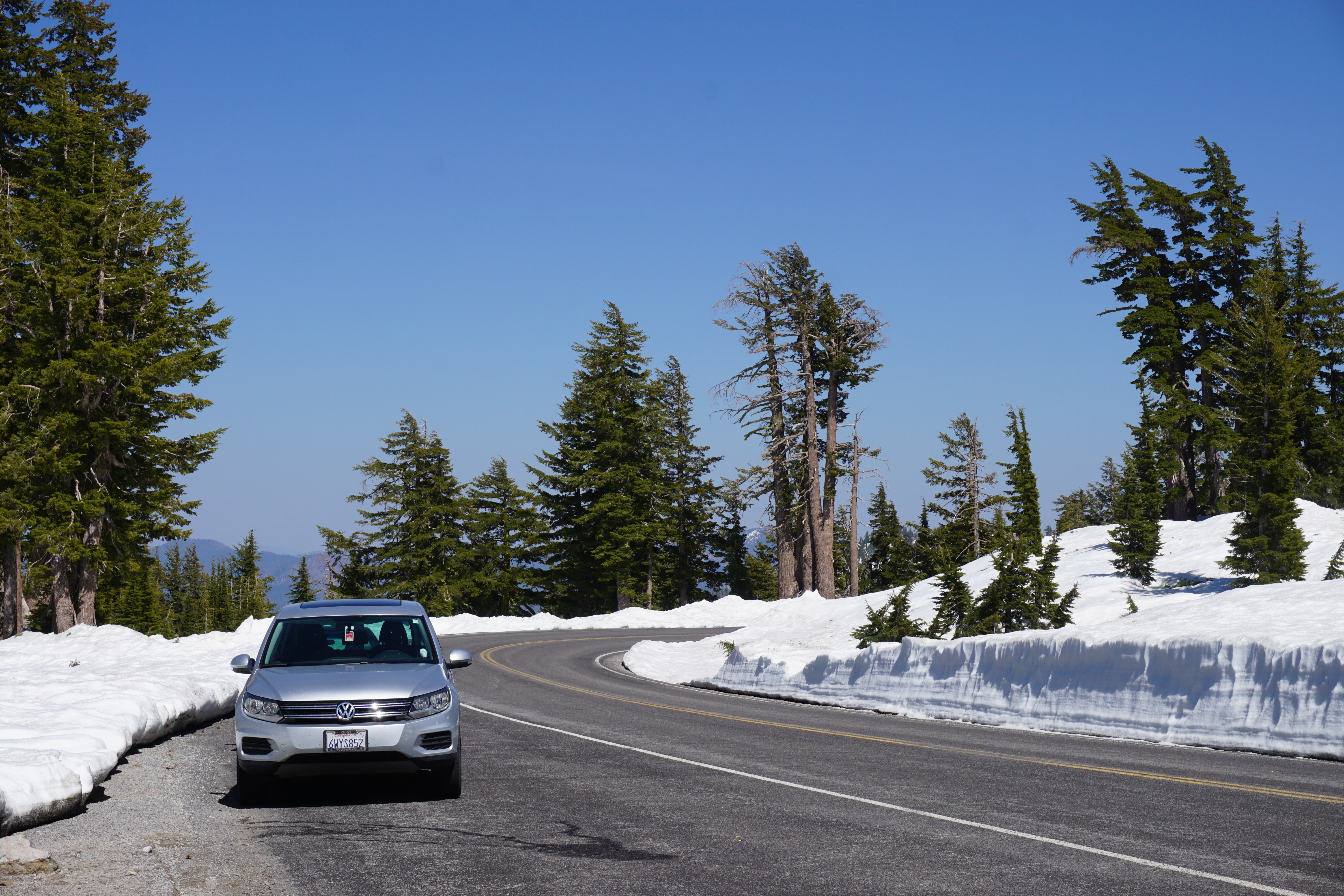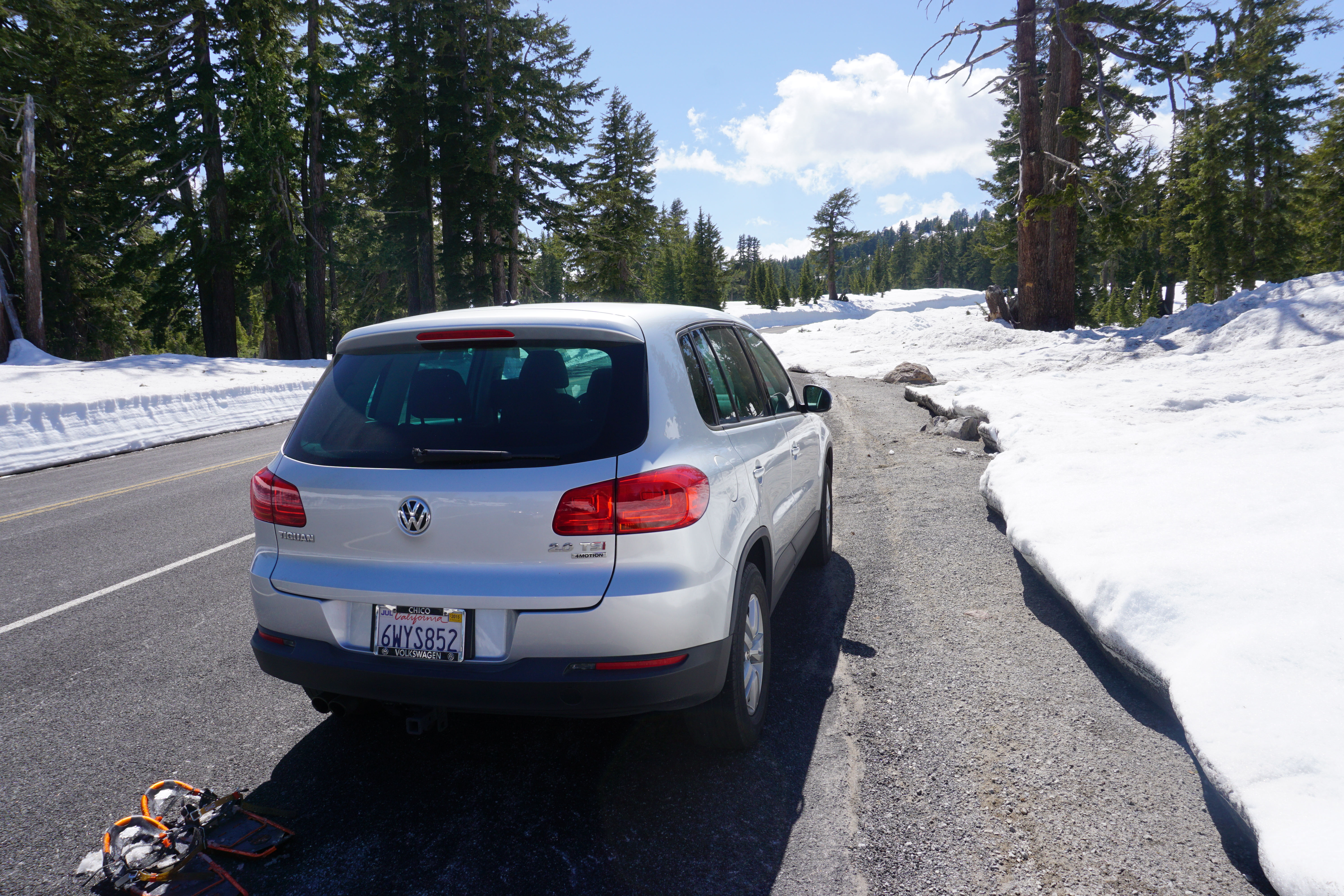 After I was done kick’n it in the meadow, I gathered my stuff and hiked out. Hiking out was significantly easier than hiking in, as I already knew where the trail was located during the non-snowcovered portion of the hike, and I was able to just follow my snowshoes for the snow-covered portion of the hike. As I emerged from the snow covered wilderness and back onto the road, some old guy was standing near my vehicle with a professional grade camera trying to snap photos of Mt. Lassen. When he saw me with my gear, Sony a6000 hanging off my neck, and snowshoes strapped to my feet, he exclaimed, “Wow! You are way better prepared for this day than I am.” “Damn straight, old man. Prepared is my middle name,” I thought to myself. Instead, I just said something nondescript and we chatted a little while about the tracks left on the side of Lassen by backcountry skiers and boarders. He was actually a pretty cool old-dude. I’m glad I bumped into him. After we finished chatting, I snapped a few more photos of the Tiguan, aka Sexy Beast, and the snow covered wonderland. From there, I headed down the mountain and made my way home.