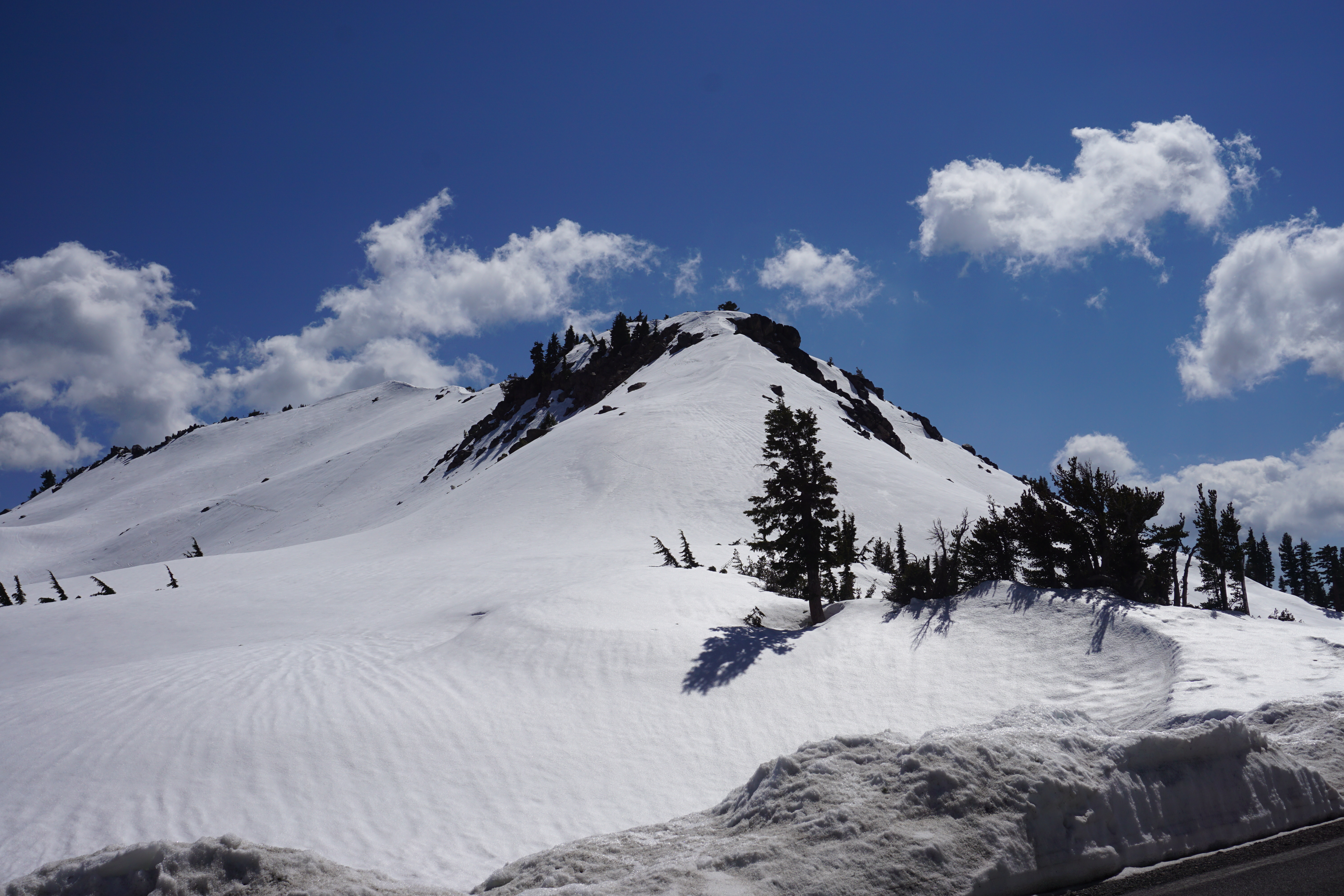 I went up to Lassen National Park, which is one of my favorite local hiking spots. I mean it’s only a 40 minute drive from my place, and it tends to be crowd free (today I virtually had the park to myself). Normally I wait until June or so until I really start hiking up there, but I figured I’d check it out early season just to get a flavor for the type of weather I’m going to be experiencing up in the Canadian Rockies this summer. True to form, the temperature remained brisk, and hovered between 45 and 60 degrees for the entire time I was up there. Luckily, I went up there prepared, and wasn’t even slightly cold. I even brought my snowshoes along. And good thing, too. Because the first thing I noticed when I got out of the car was snow. Lots of snow.