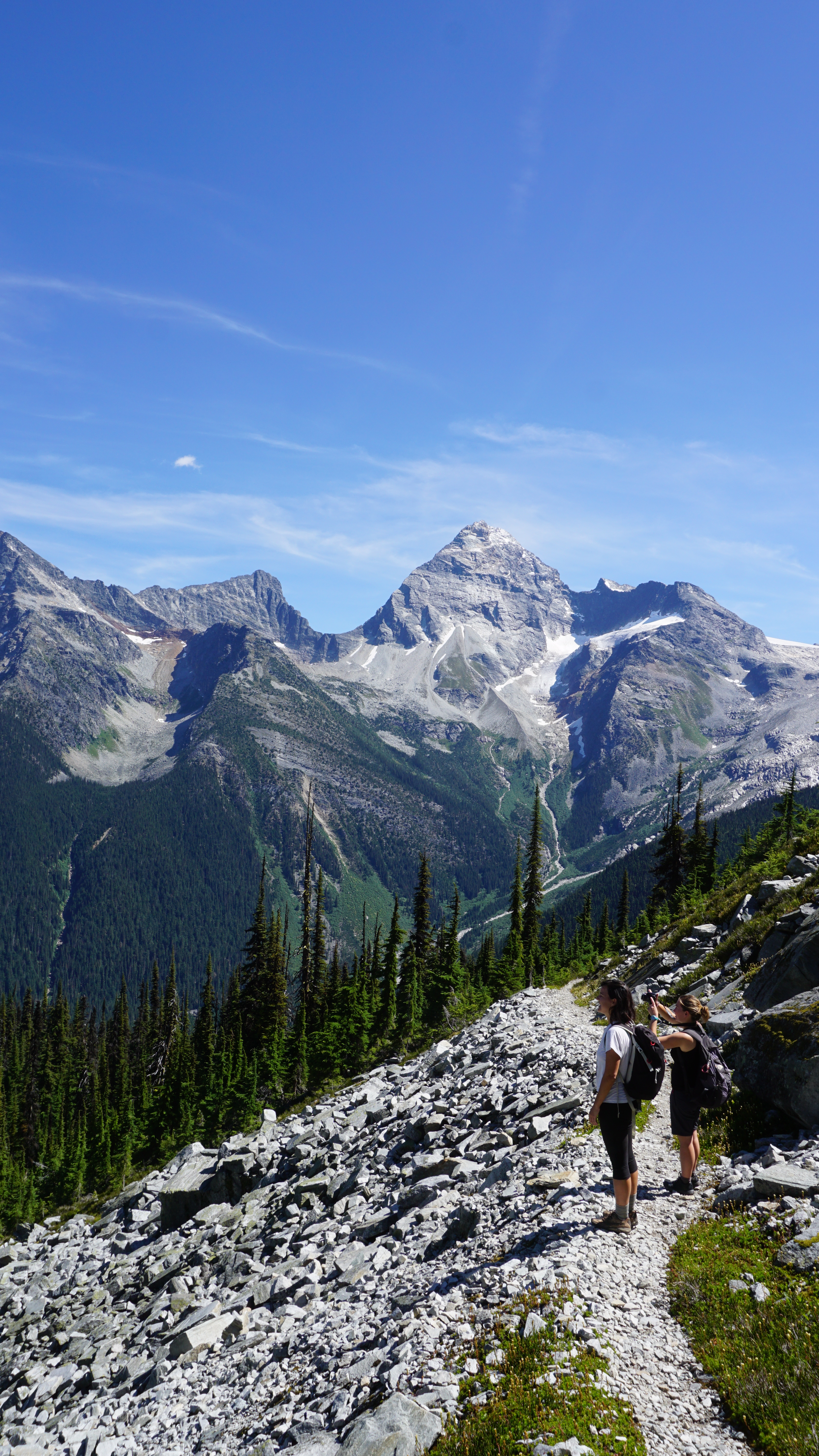 Having made the kind of claim to property that would have made whoever it was who tried to colonize the Congo proud, I started towards the trailhead allotted to me by Canadian regulation.  As soon as I’m about to take my first step on the trail, I hear a voice.  A pretty voice!  The kind of voice that comes from a girl with a European accent.  “Hello, where are you hiking?” the stranger asks.  I turn my gaze to see two girls staring back at me.  “Abbott Ridge,” I reply.  “Oh, we are going there, too,” the girl says, and then asks, “would you like to tag along with us?”