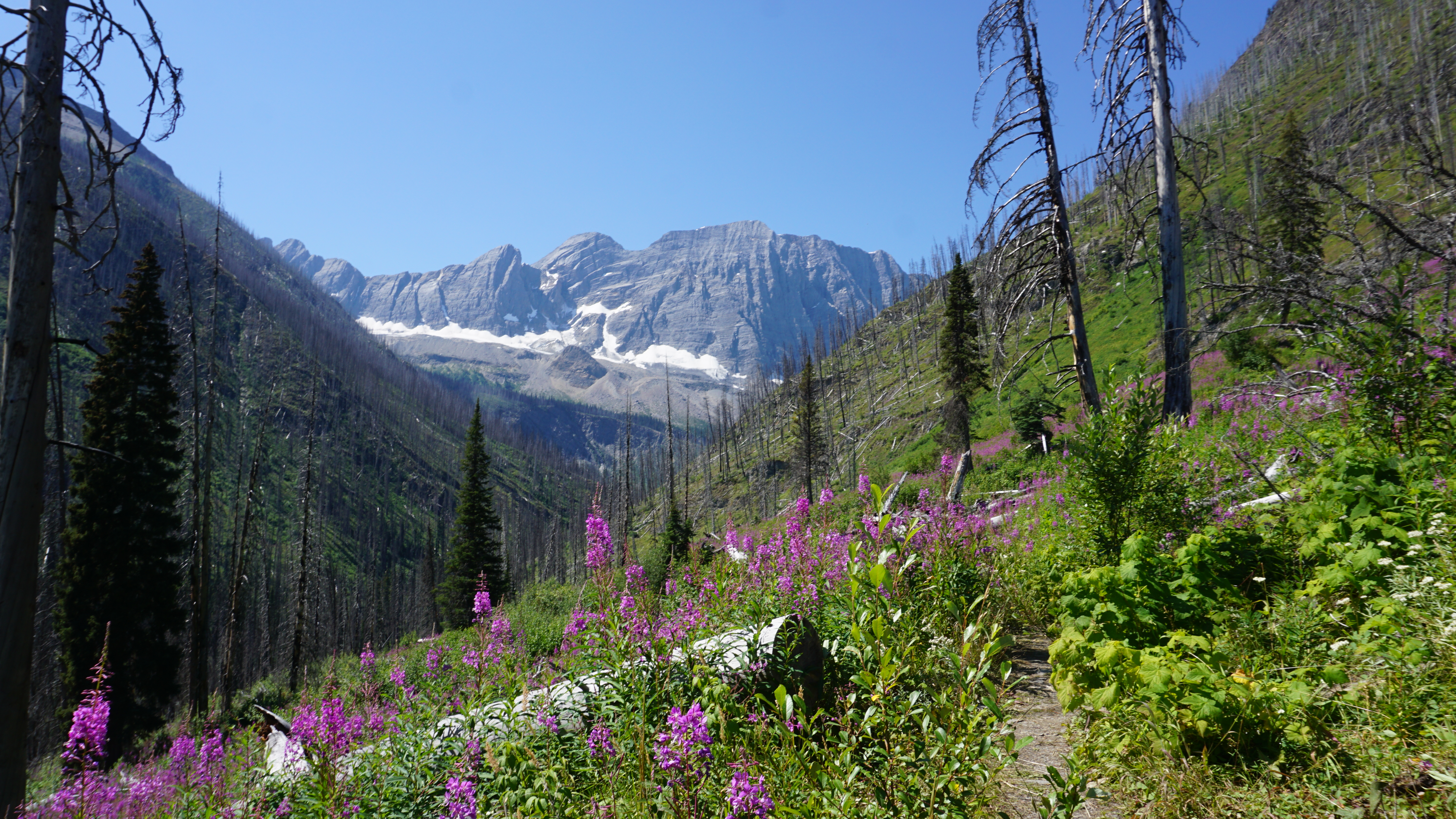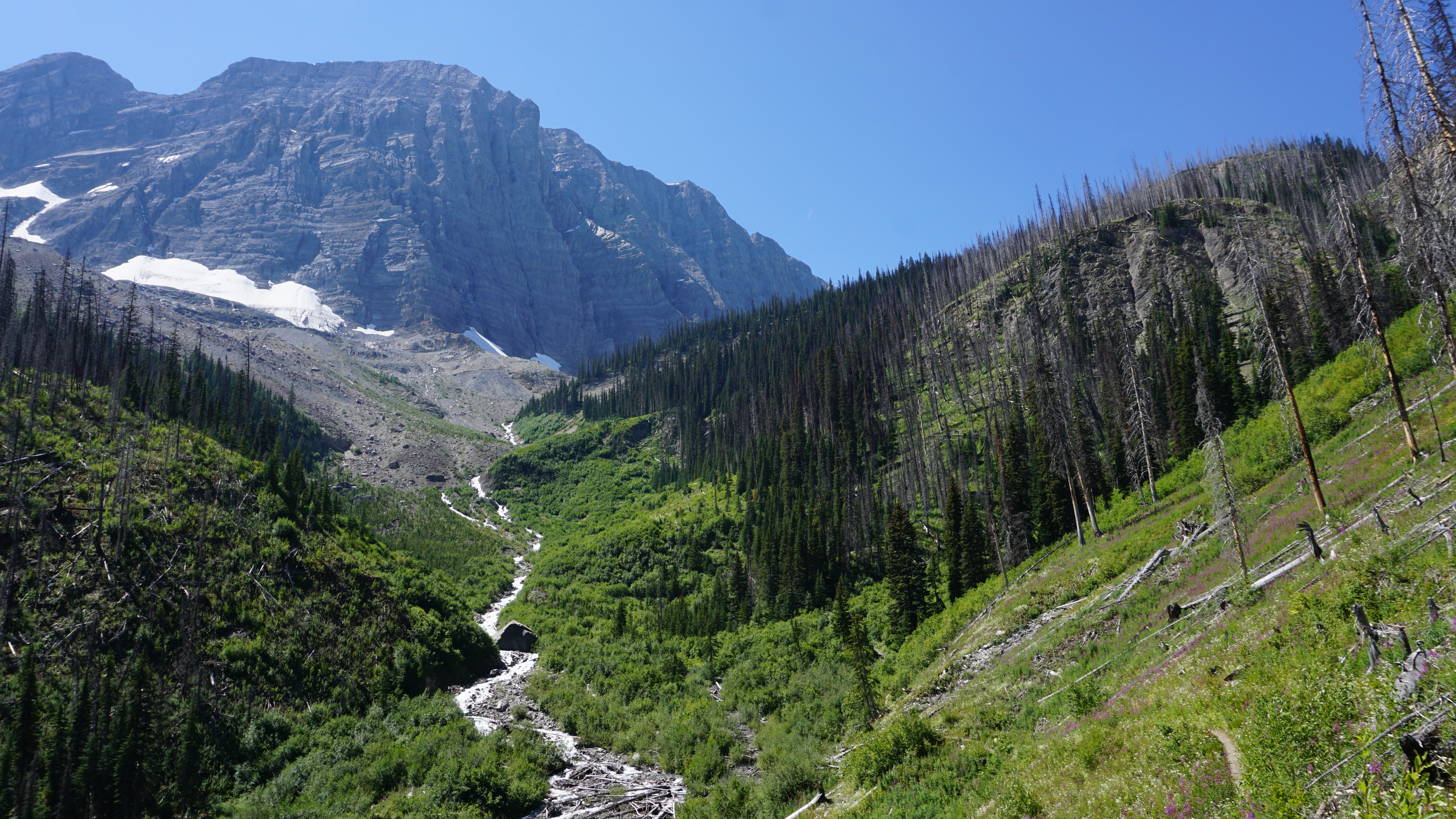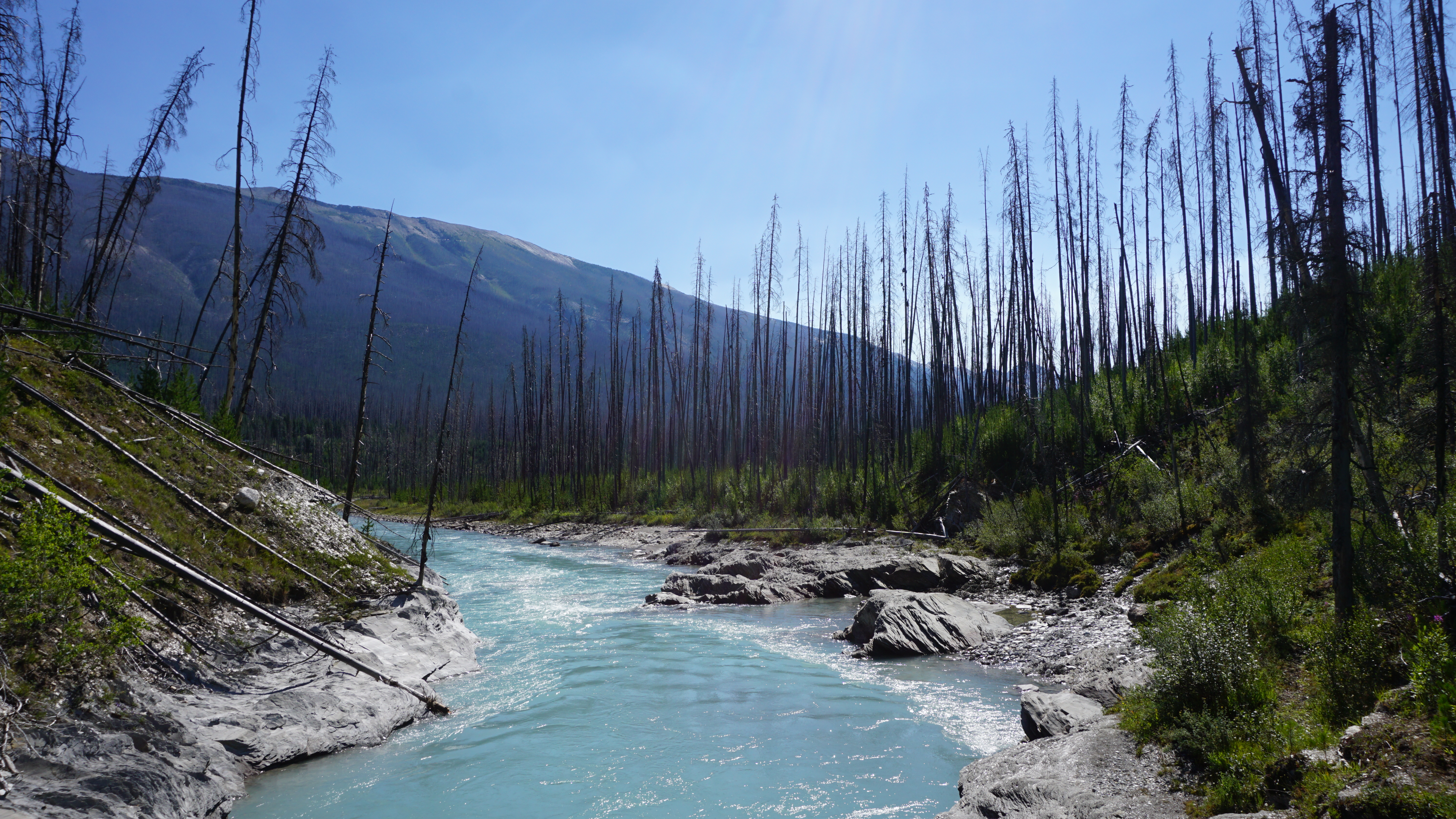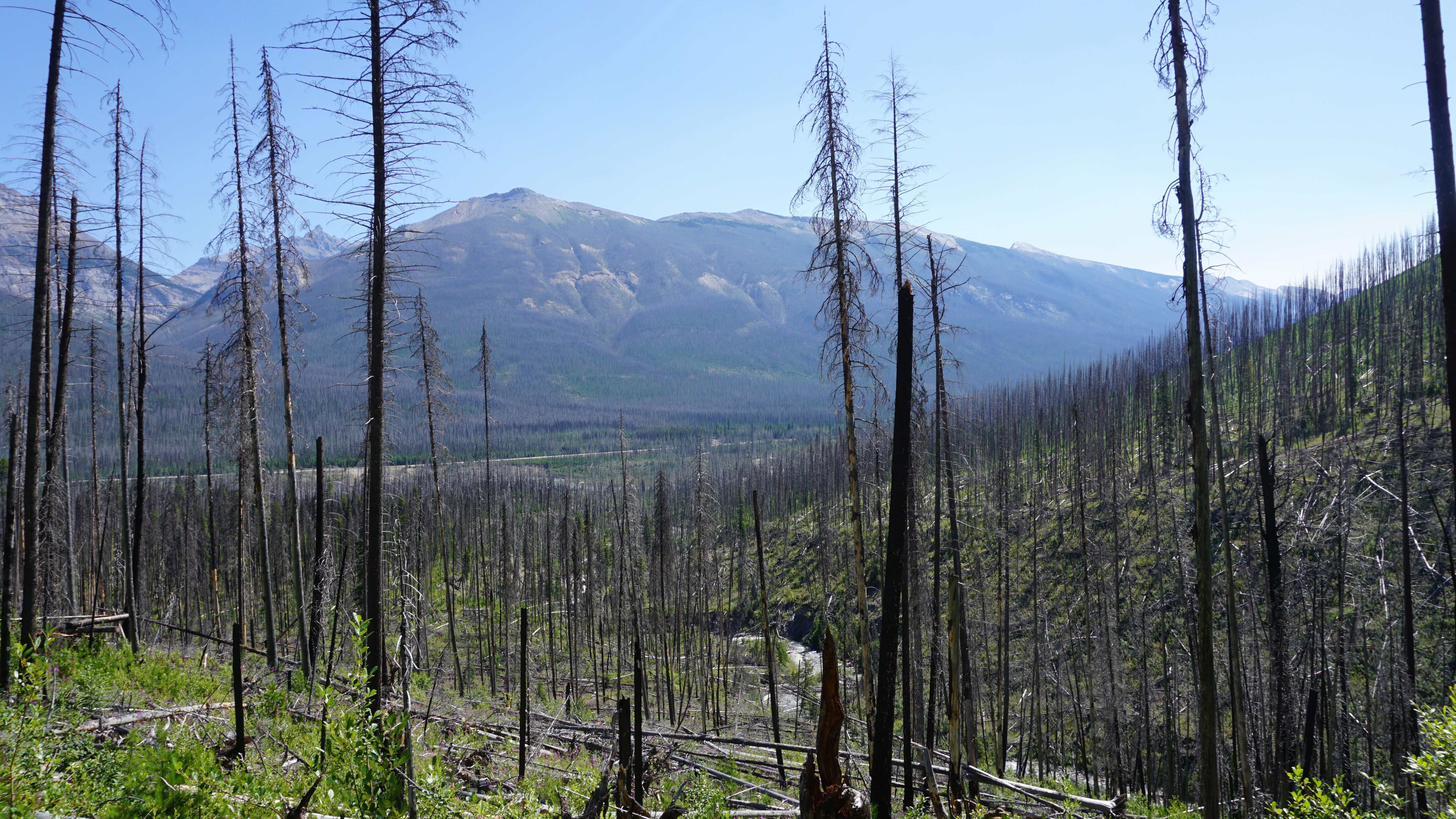 As has become usual for the trip, I drove to the site first thing in the morning, a pretty drive that took me through the British Columbia countryside and Radium Hot Springs. When I got to the trailhead, I got my pack together, and took off into the wild, this time by myself. A fire ravaged this area a few years ago, making the start of the hike a bit ominous.