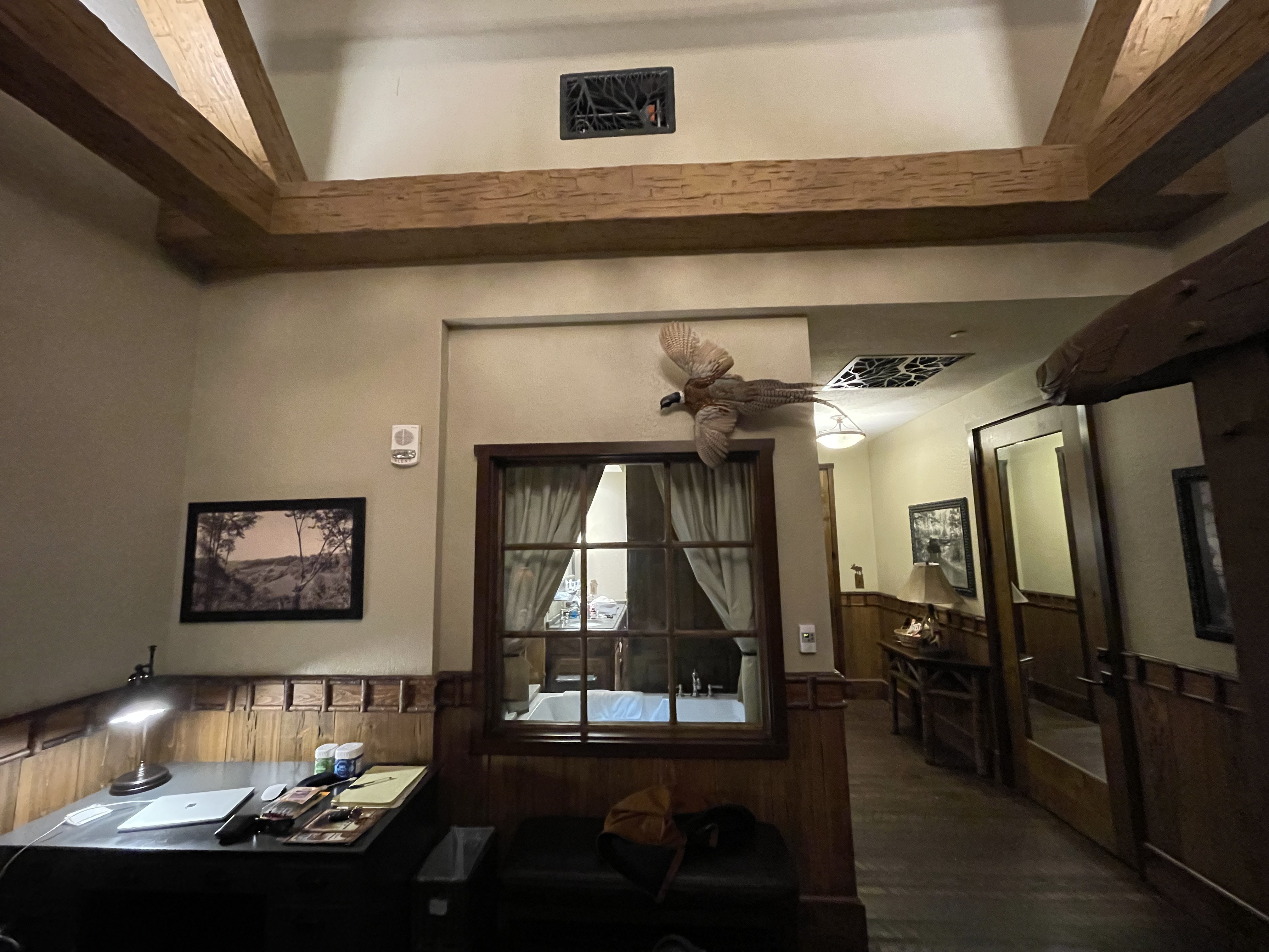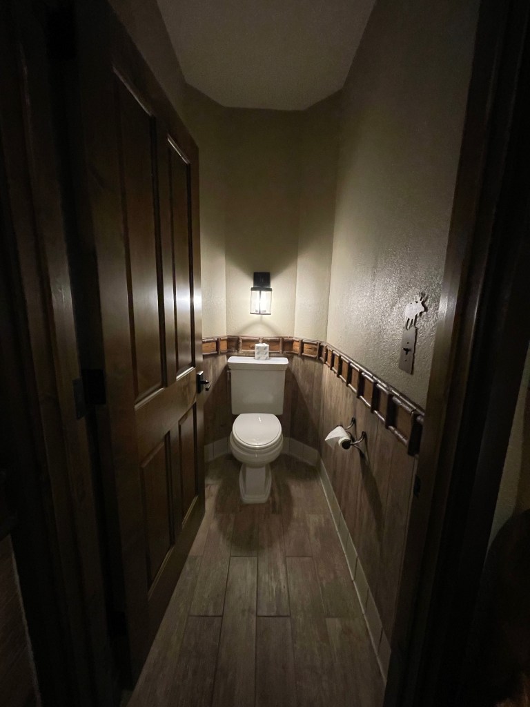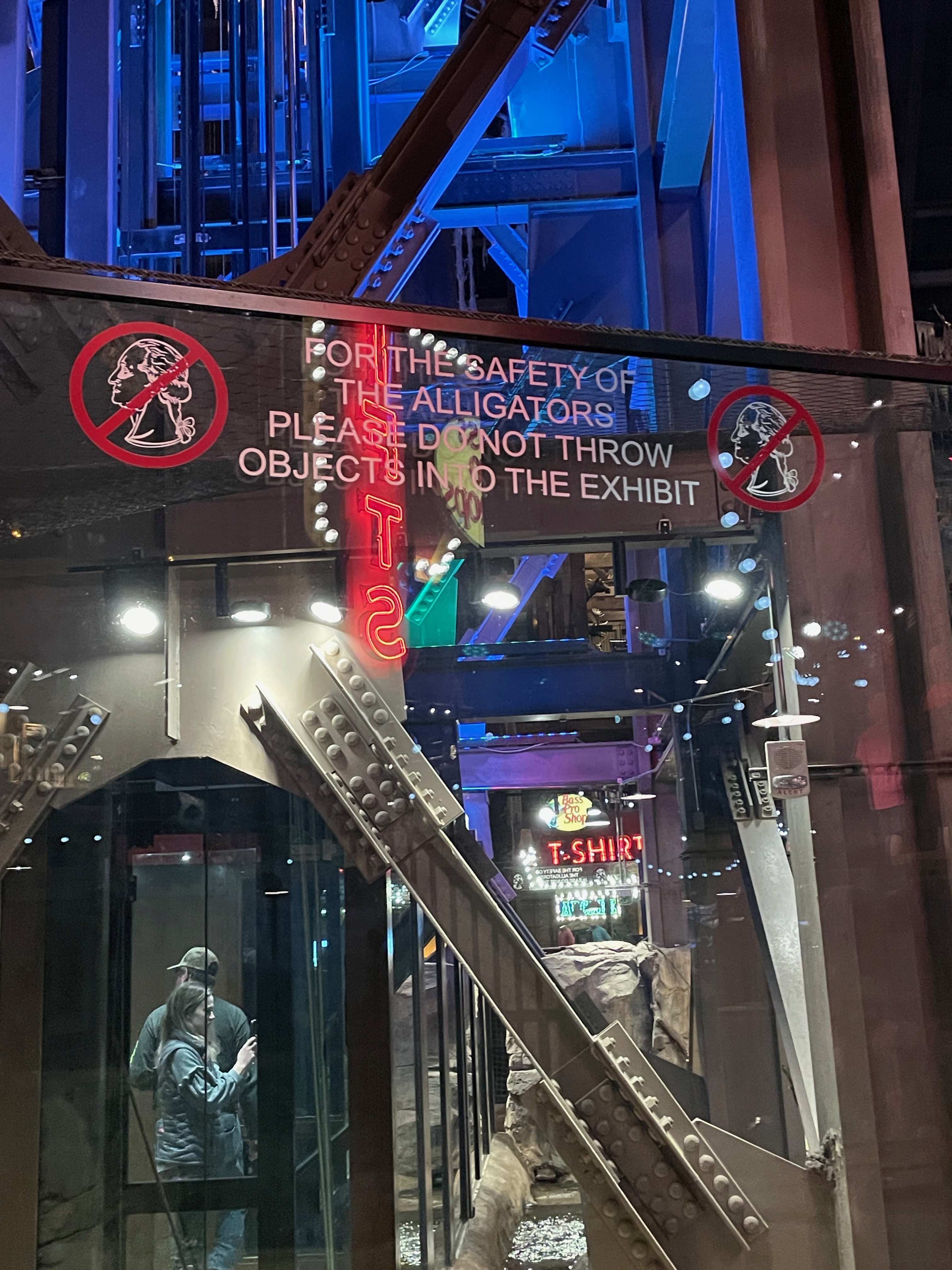 It’s actually a pretty cool place! I’m having a blast here, and heck, I could even see my old law firm flying out here for an attorney retreat. There are signs telling you not to bother the ‘gators, there are at least three restaurants in the place, you can buy a boat if you want, and the views of downtown and the Mississippi River from the ‘pyramid-top’ bar and restaurant are phenomenal. And as for the hotel room? It’s dimly lit, full of antlers and dead animals, and otherwise decorated over-the-top masculine. Even the toilet is made to look like an outhouse, and each floor of the hotel comes equipped with a full bar and piano, because you shouldn’t have to walk more than 100 feet to make your way to the nearest bar. If only the little woman could be here to enjoy this with me. Oh wait…I’m single.