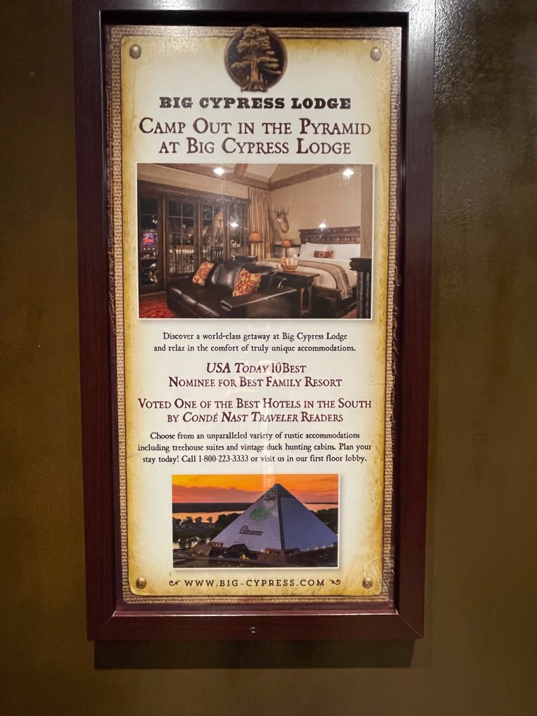 Ladies and gentlemen, have you ever felt the strong urge to sleep not in a hotel, but in a windowless faux hunting lodge located inside of a Bass Pro Shop? Have you ever wanted to stay in not just any Bass Pro Shop, but a Bass Pro Shop taking the form of a 30-story pyramid!? Have you ever had a hankering for the view from your room’s window to not be of the city that you’re in, but of a Bass Pro Shop store floor, with all of the fun, typical sounds of people wandering about the inside of a Bass Pro Shop? Have you ever felt the desire to carry all of your luggage through a Bass Pro Shop to make it to your guest room?