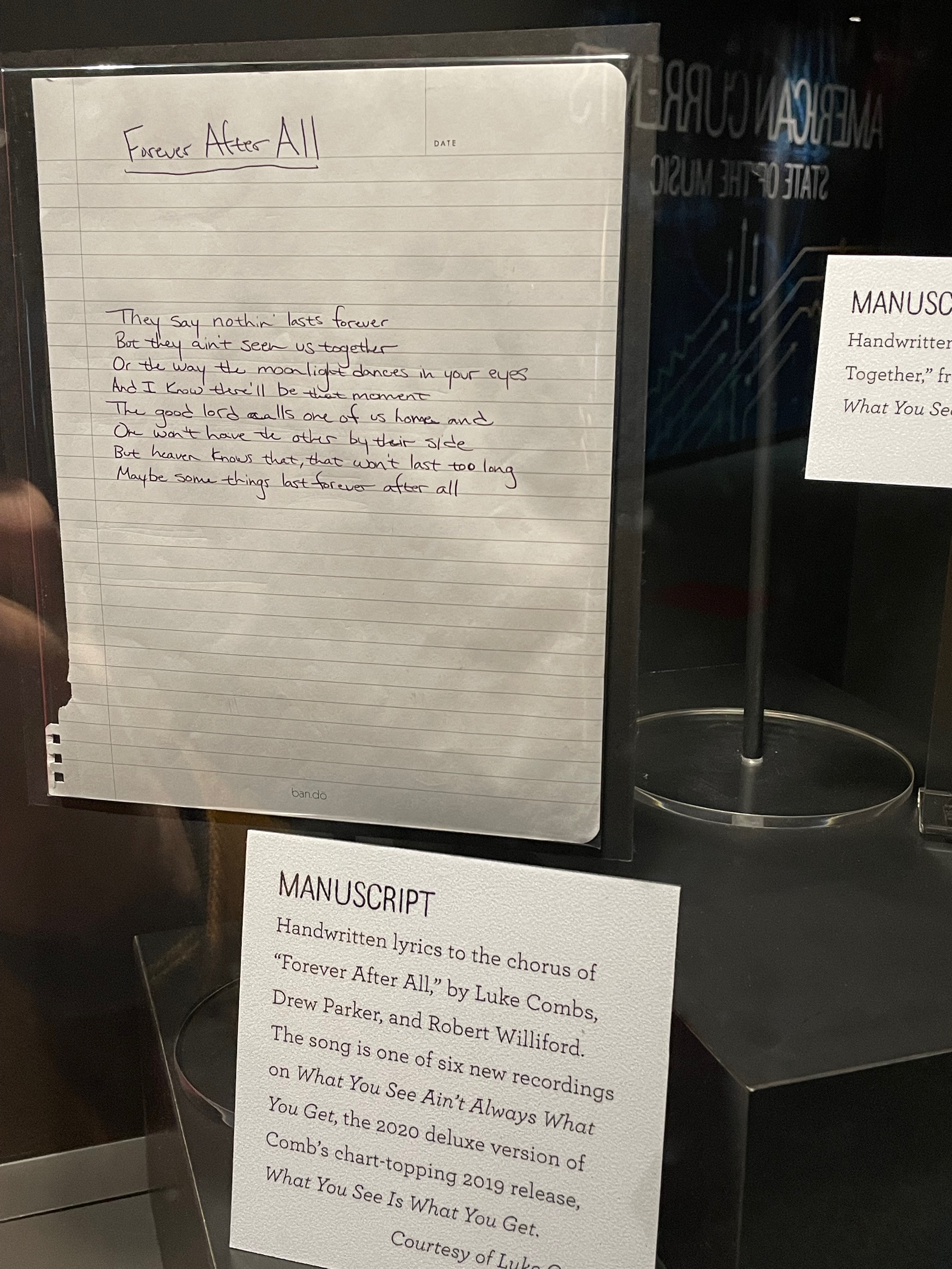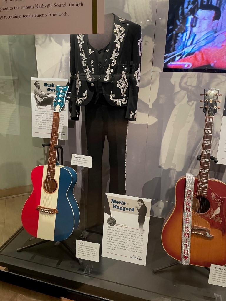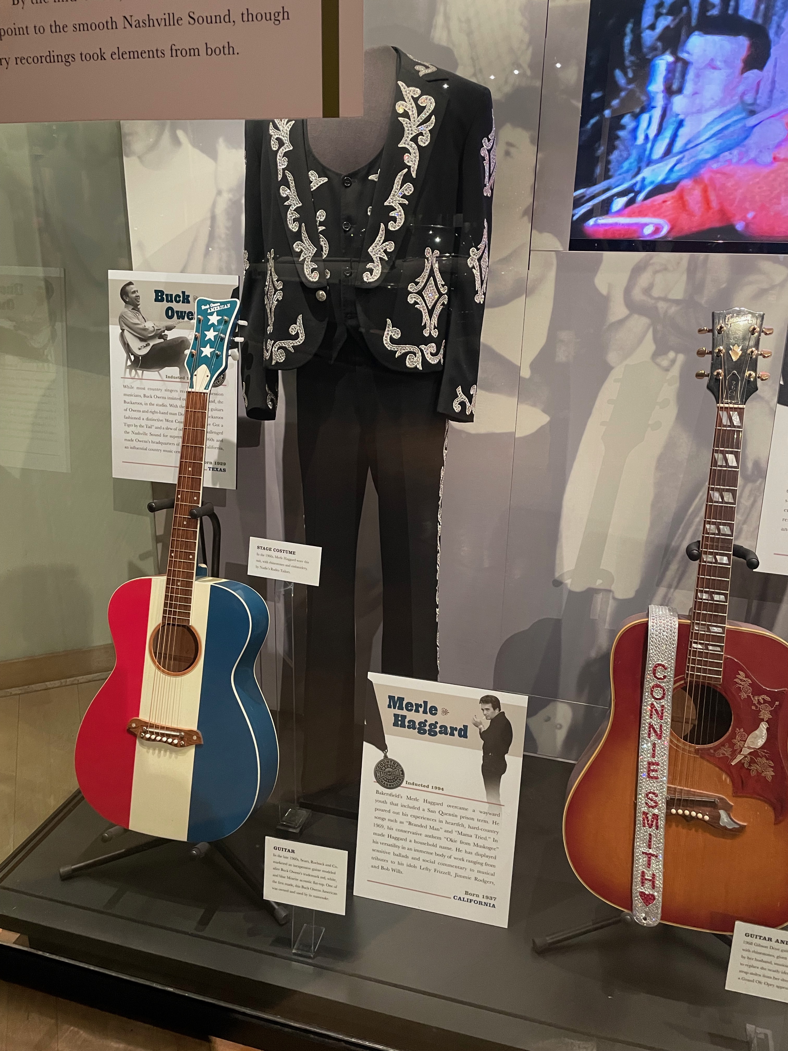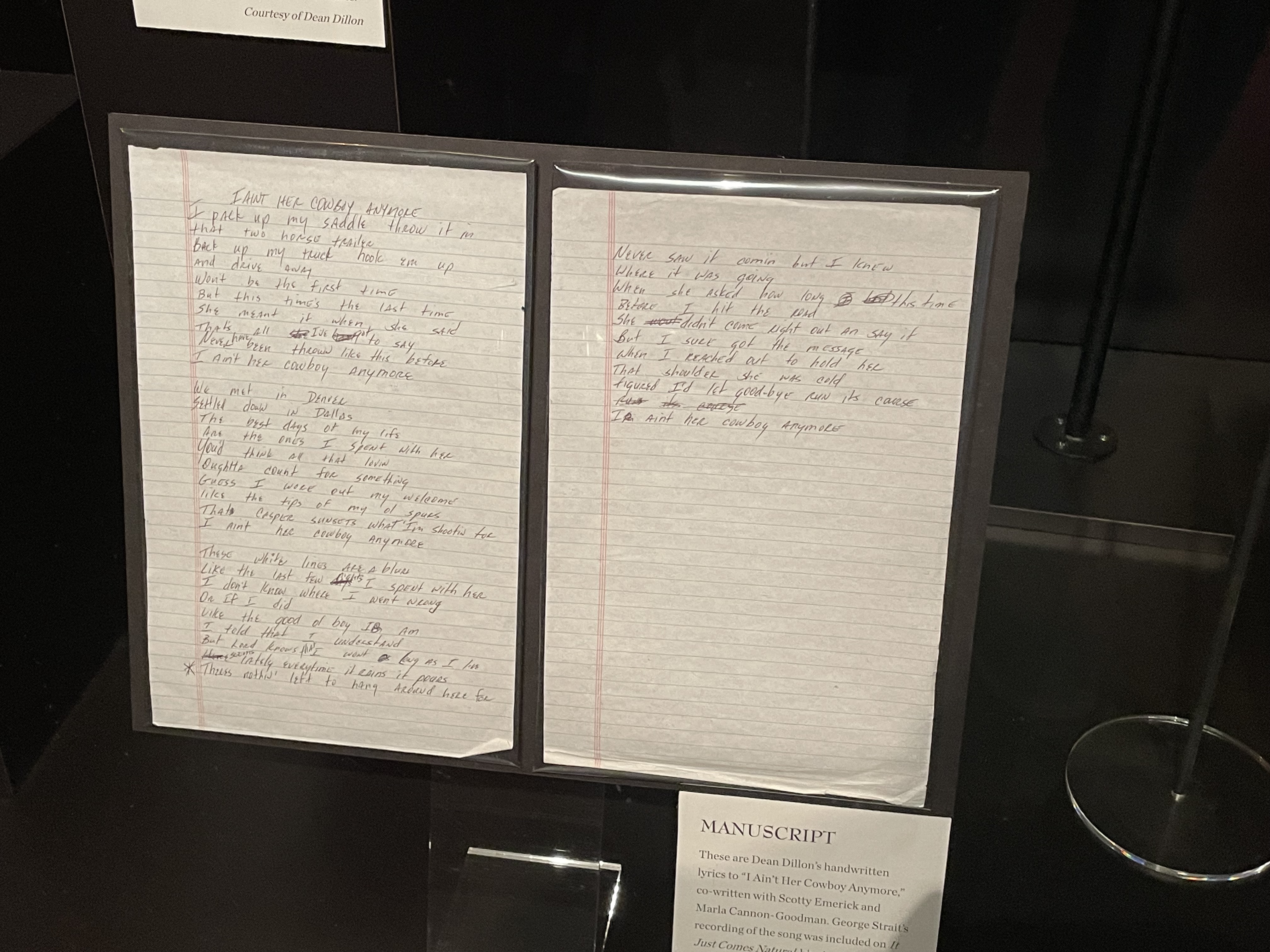 All kidding aside though, I’m having a good time in Nashville. I spent the late morning/early afternoon at the Country Music Hall of Fame, which was kind of exciting, and for exhibits had several of the original song lyric pages that country musicians had scribbled in their notebooks long before their song became a hit; and history and artifacts on tons of artists (Merle Haggard and George Strait most interested me – Merle because he had lived up in Shasta County, California where I am from and fun fact I had the honor of helping process the probate of his estate after he passed, during my time working as a research attorney at the Shasta County Superior Court (bet you didn’t know that piece of trivia about me); George because…well because he’s George). Oh, and the Taylor Swift Education Center was there, which I found really amusing because the doors to the place opened up to reveal a trashcan!