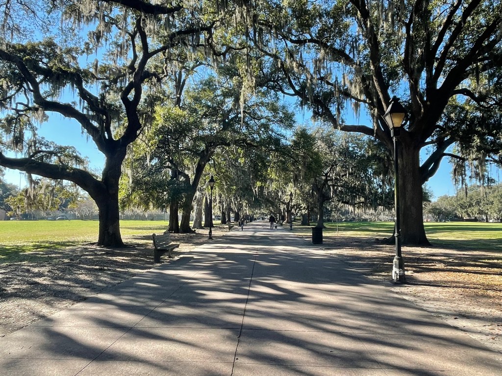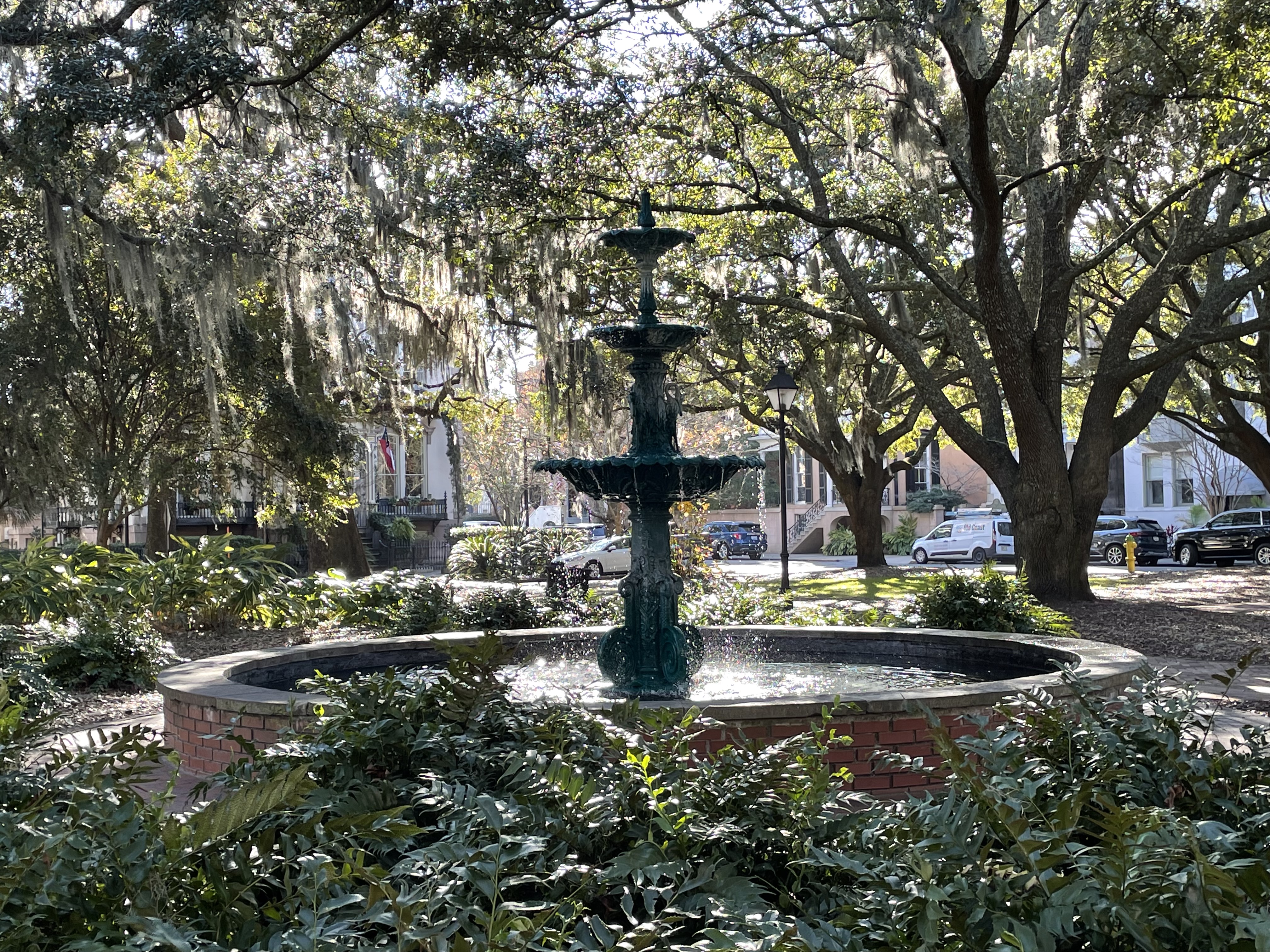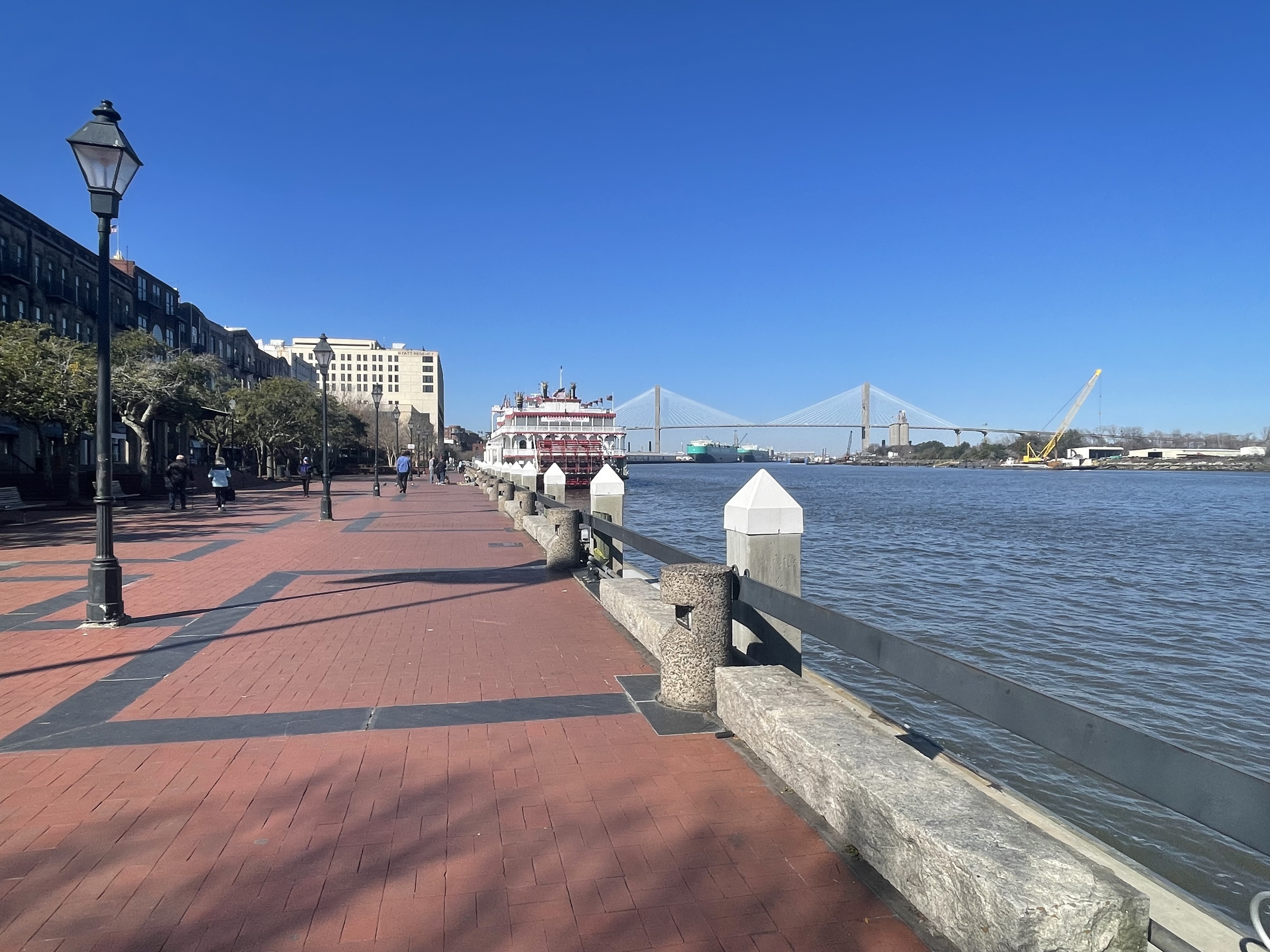 Leaving Charleston, I once again had to travel through a bunch of monotonous swamps. But as I approached Savannah, the landscape changed. The area around Savannah is not swampy. It is instead filled with rivers, marshes and grassy wetlands that reminded me of the wetlands between San Rafael and Vallejo in the North Bay back in California. Water fowl could be seen wandering the marshes and flying about all over. The town itself is nestled against the Savannah River, with a long river walk along the river’s shore. Huge river boats and shipping vessels busied the waters.
