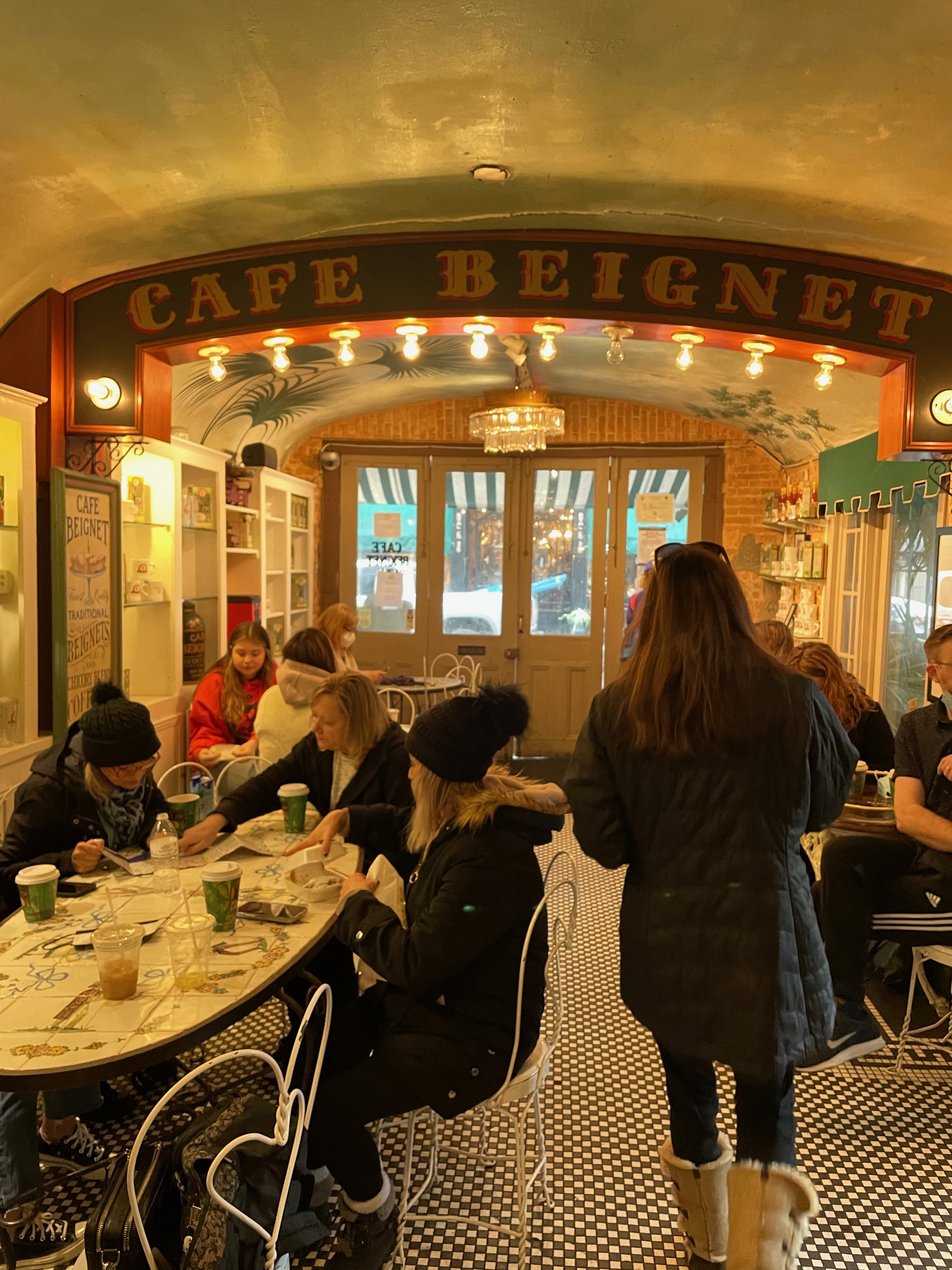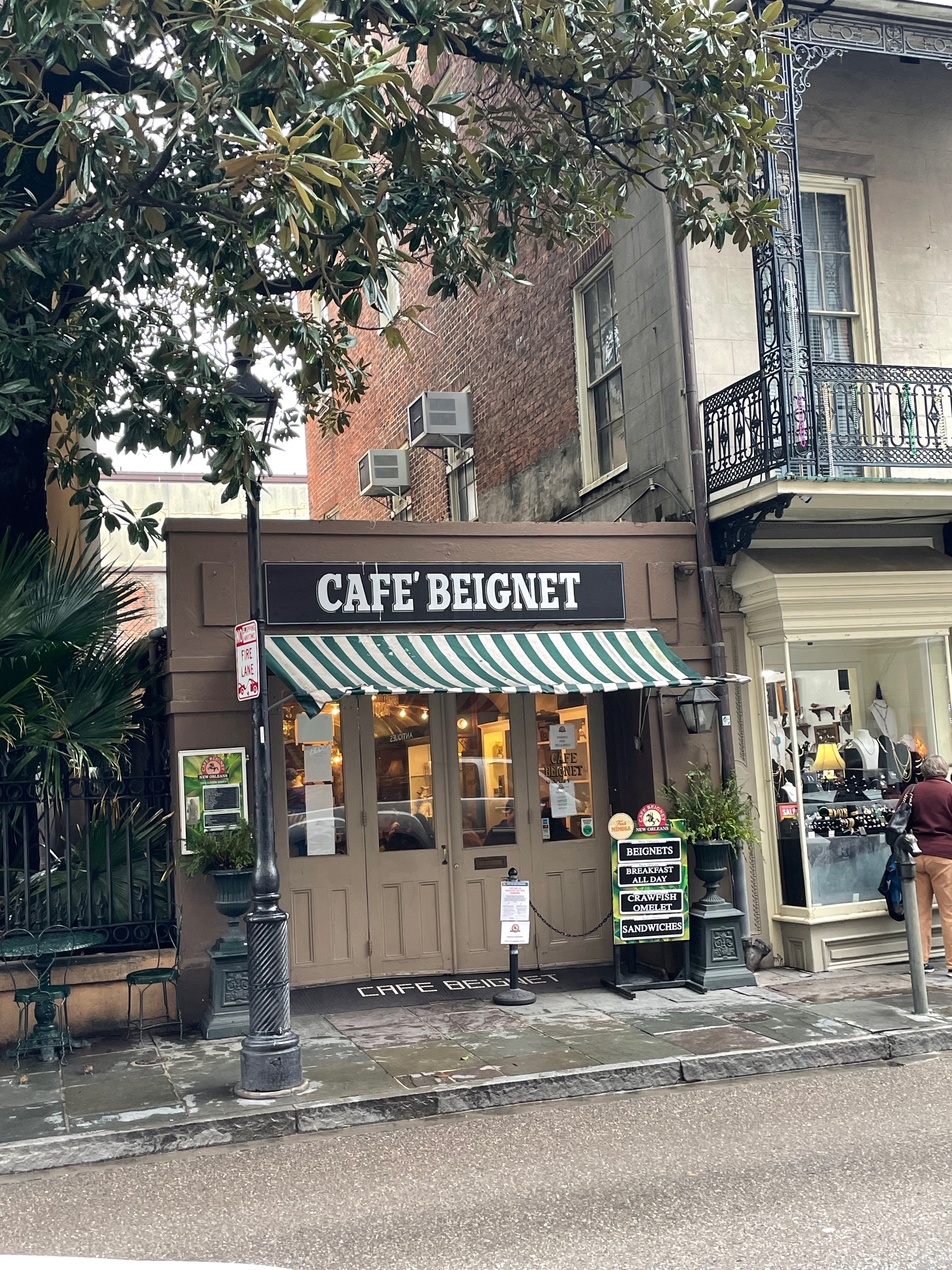 First thing’s first, the beignets! There are many beignet spots in New Orleans. Cafe du Monde is probably the most famous, as it was the original spot for beignets. However, I chose Cafe Beignet Royal, which is a pretty highly rated spot. Wandering the wet streets, I found the spot and after fighting the crowds to the front of the line, I finally got to try authentic beignets for the first time. Sadly, I had to eat them outside in the rain because it was so busy inside that I could not find a table. They were still delicious though! First goal of the day: success!