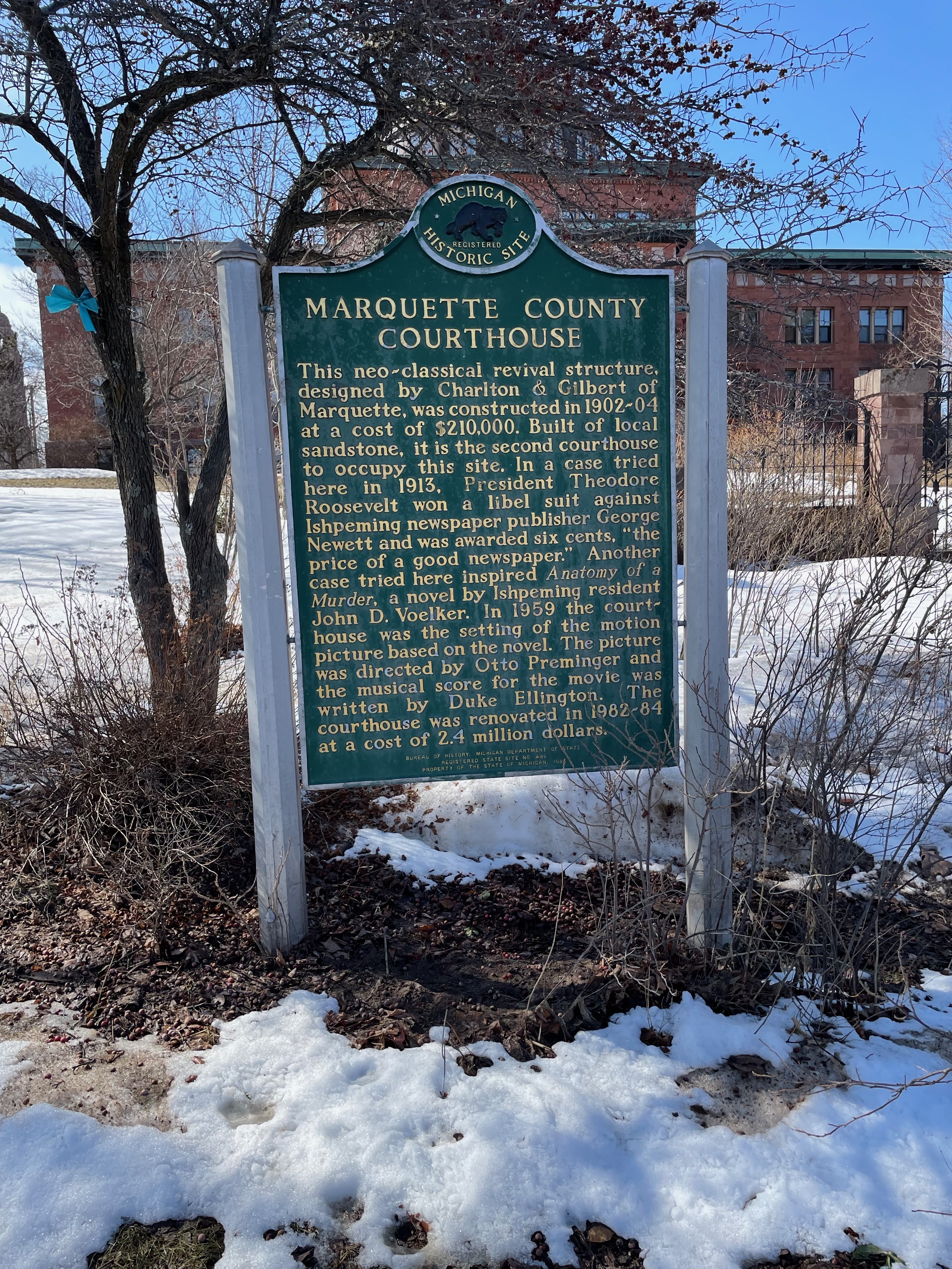 But there’s more history! The local courthouse is fairly famous. You may have even seen it before, if you have seen the 1959 movie, Anatomy of a Murder. The movie, starring Jimmy Stewart, is based on a true story about a UP country attorney who takes a case defending a man charged with murder. It is highly regarded as the best trial movie of all time, and it was filmed here in Marquette. But earlier in history, the courthouse was the site of a different drama – one involving President Theodore Roosevelt suing a local paper for libel. The case was more of a ‘principle of the matter’ case than about money, but President Roosevelt won. Here’s the courthouse from outside: