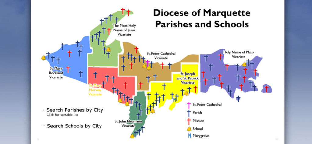 As you may know, I am the new Executive Director of Stewardship and Development for the Diocese of Marquette. It is a very exciting career that is equal parts traveling about, evangelizing, meeting with Catholic communities in various areas, understanding each community’s stories and needs, and working with staff, priests, nonprofits, endowments, and donors to meet those needs. The Diocese’s jurisdiction is huge, encompassing the entire Upper Peninsula. It consists of nearly 10 Catholic schools, over 90 churches, and several other Catholic institutions. As with other Diocesan reaches in the country, the area is split into ecclesiastical regions called “vicariates.” Here, we have 7 vicariates. Before this week, my travels in the UP were limited to the St. Peter Cathedral Vicariate, which makes up the regions around Marquette (the brown area on the map). Today though, work allowed me to travel to meet the Catholic community in another vicariate: The Most Holy Name of Jesus Vicariate. If you are not deeply entrenched in the Catholic world, then this place has a different name: the legendary Keweenaw Peninsula.