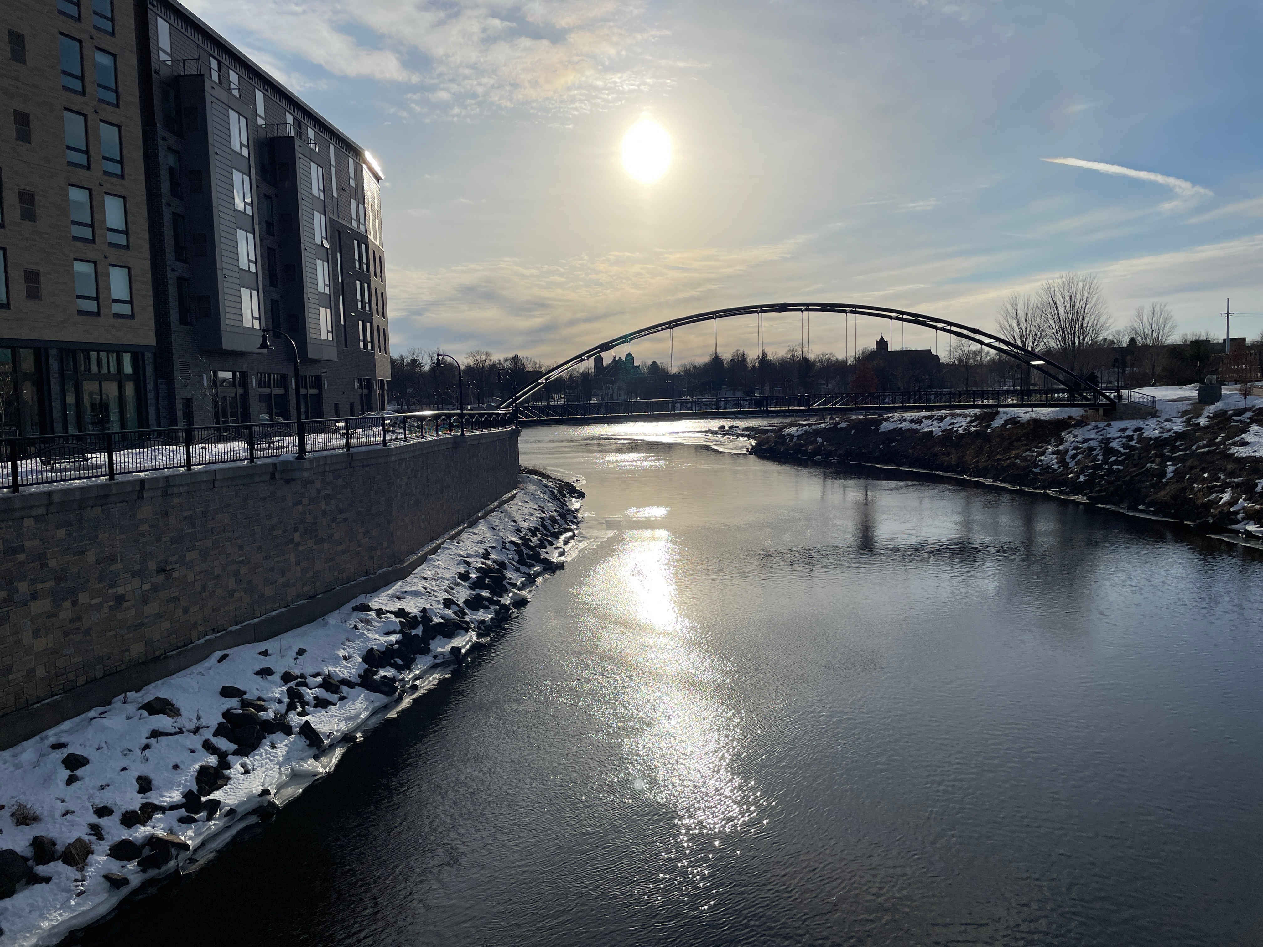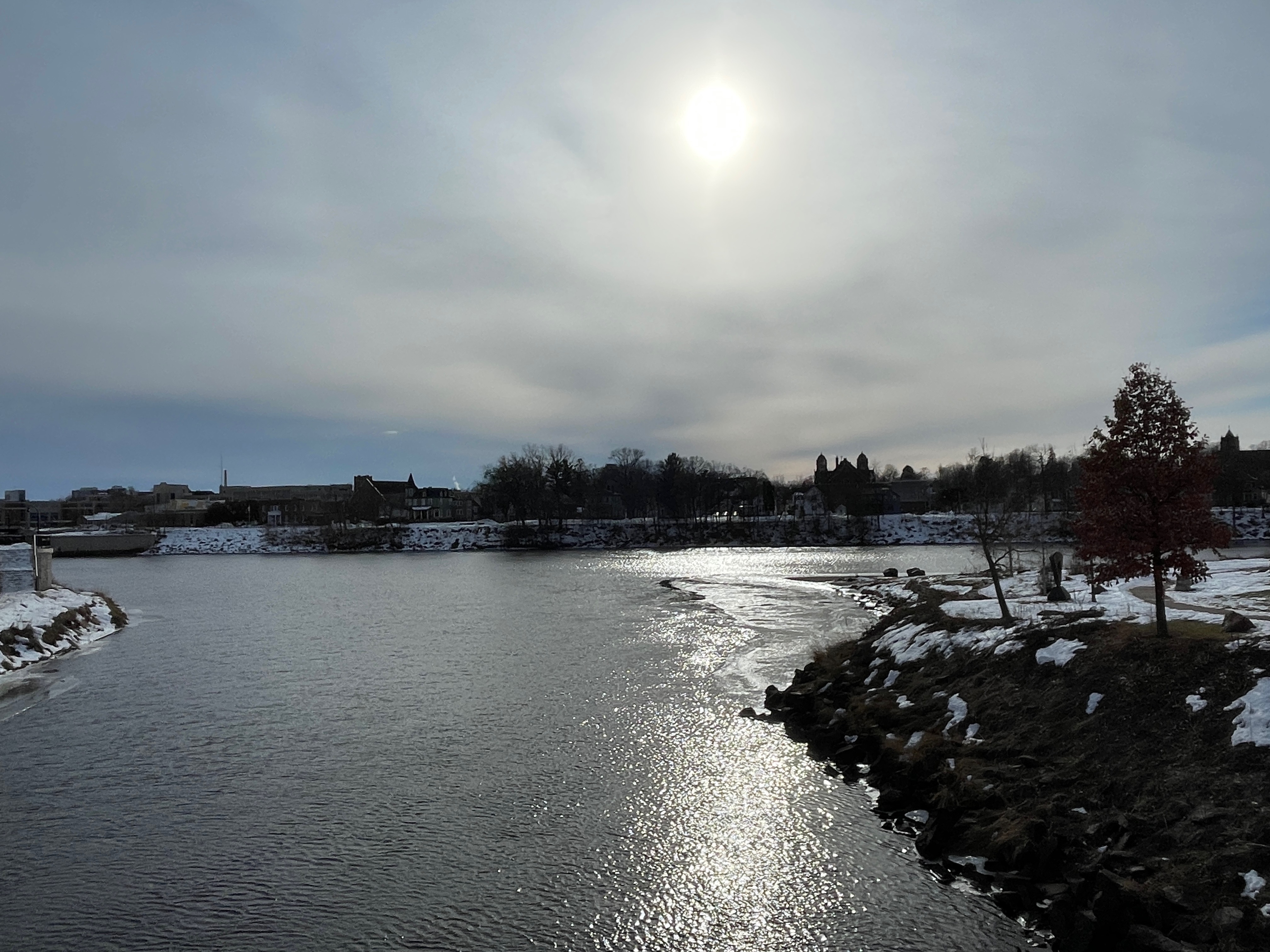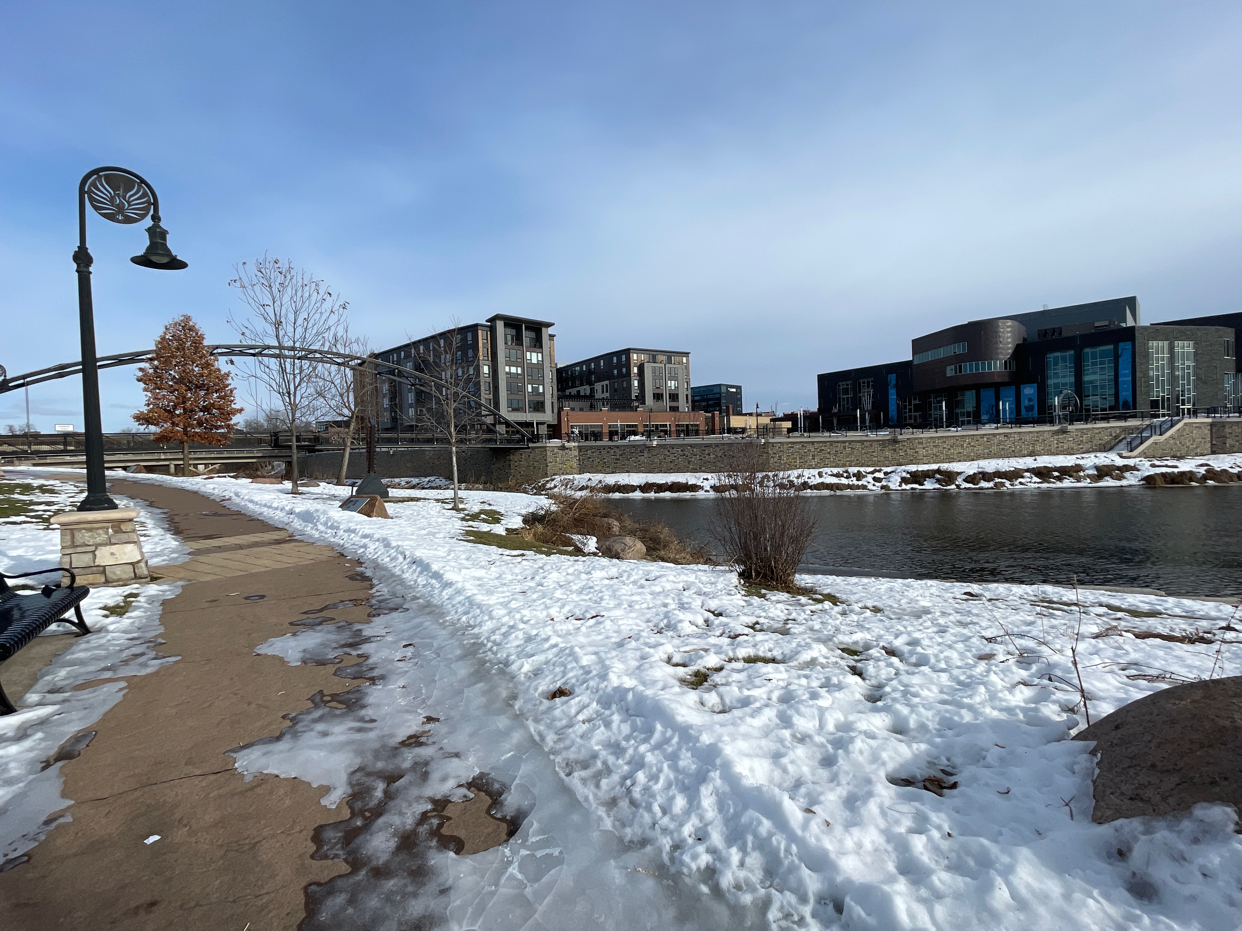 I’m currently taking a short vacation in Eau Claire, which is a small city in central Wisconsin located at the confluence of the Chippewa and Eau Claire Rivers. The city’s name (which is pronounced like “O’Claire”) means “clear water” in French, and indeed the place has a LOT of water. In fact, I’m not sure that I’ve ever been to a place quite like this – where walking paths and bridges galore criss-cross over the various river banks and islands that make up the city. It makes for an immediately walkable downtown, and in fact you want to walk around a bunch, if only to cross all of the bridges, see all of the views from said bridges, and explore the large number of businesses, bars, and restaurants nestled into the various districts. It is probably downright dreamy in the summer and fall months, but I of course am here in the winter (it’s currently 9 degrees outside with windchill).
