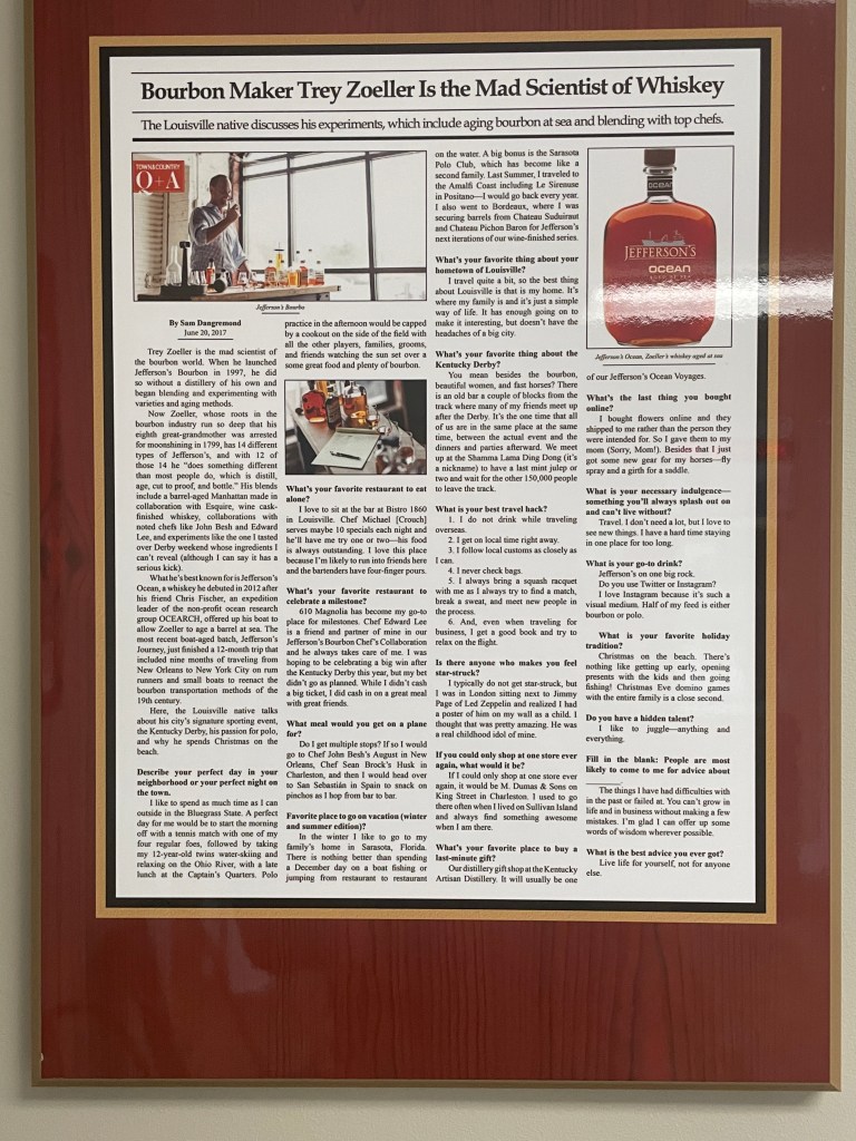 Makes me want to drink some rye bourbon. We’ve been to that artisan distillery before … my thought about the Jefferson’s ocean is that it’s a marketing gimmick and not worth the $70 or $80 per bottle. Bulleit bourbon tour was my fave one of the ones I went to in KY!