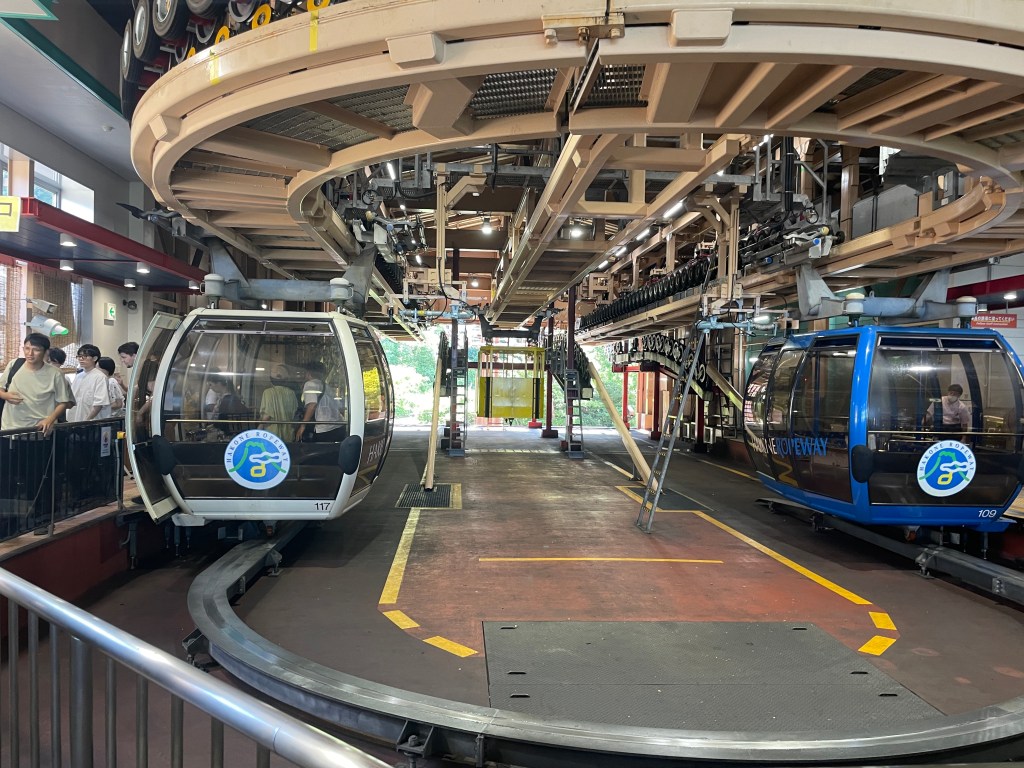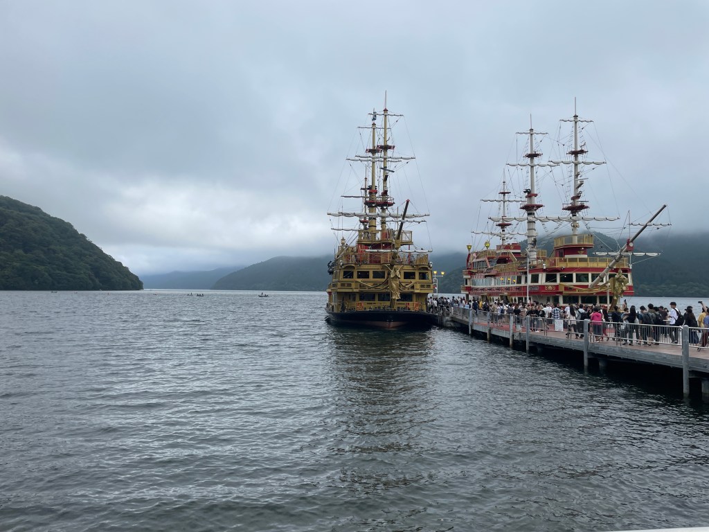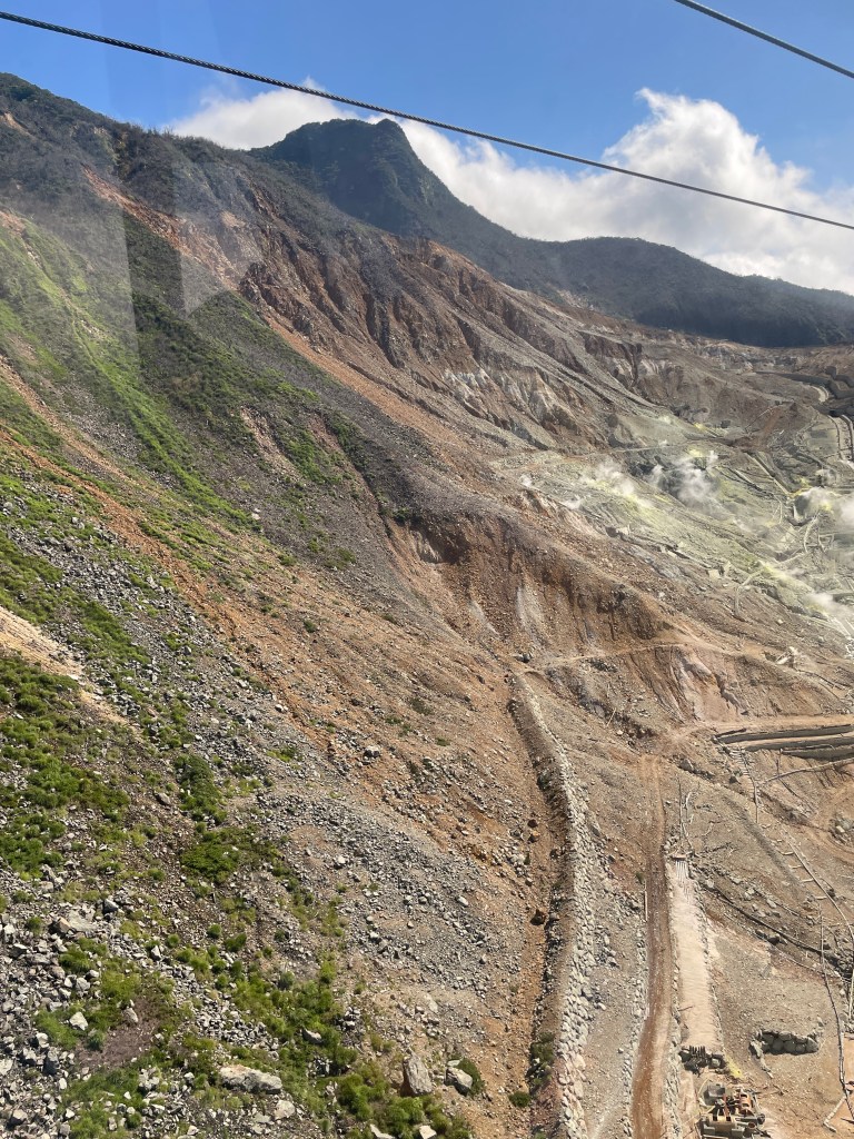 Hakone is a famous onsen town in Japan, and so everywhere you can faintly smell the geothermal sulfur that heats the area’s hot spring waters. As our ropeway climbed over the canyon, it passed by a majestic volcano. We made it to the other side of the volcano and then…an “oh no!” sensation came over us. Though being a clear day, a cold, heavy fog had developed over Lake Ashi, blocking views of both the lake and Mt. Fuji. We would be unable to see the famous mountain and lake views today. We took a quick photo of the foggy lakeshore, and turned around and headed back towards our ryokan.